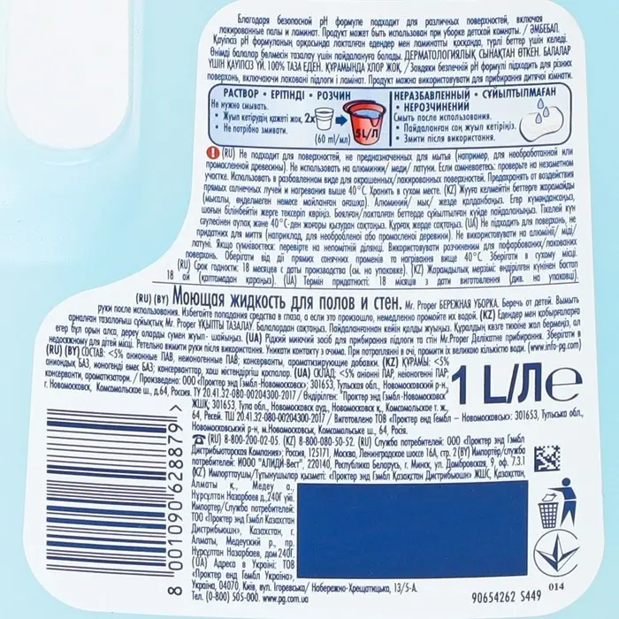 Меры предосторожности: после применения тщательно мойте руки. Берегите от детей. В случае попадания в глаза немедленно обильно промойте их водой. Для лакированного паркета, ламината и ПВХ используйте в разбавленном виде. Берегите от воздействия прямых солнечных лучей и нагревания выше 30 °С!