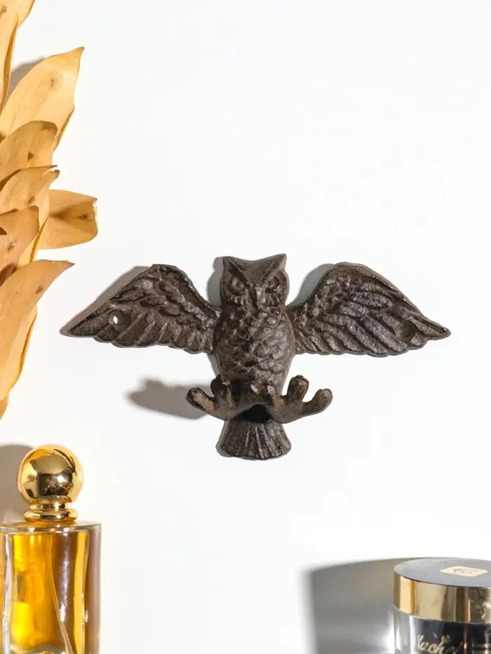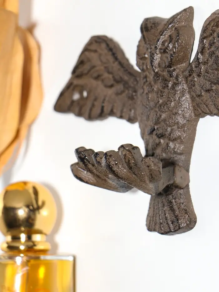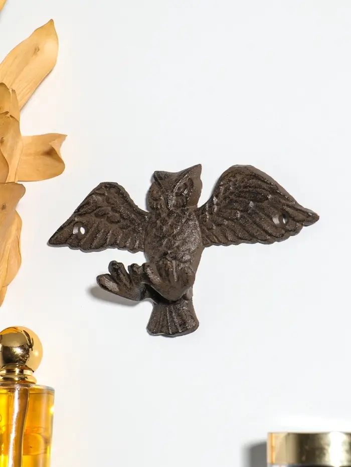 Эта чугунная ключница с летящей совой встречает вас у порога. Шесть прочных крючков готовы принять не только ключи, но и повседневные мелочи: сумку, очки, легкий шарф. Тяжесть чугуна в руке говорит о надежности, а изящный силуэт птицы добавляет интерьеру характер.