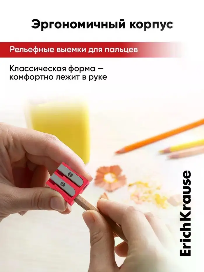 Пластиковая точилка с эргономичной зоной захвата. Два отверстия для заточки стандартных чернографитных и цветных карандашей диаметра 8 мм и 11 мм. Никелированное лезвие из углеродистой стали.