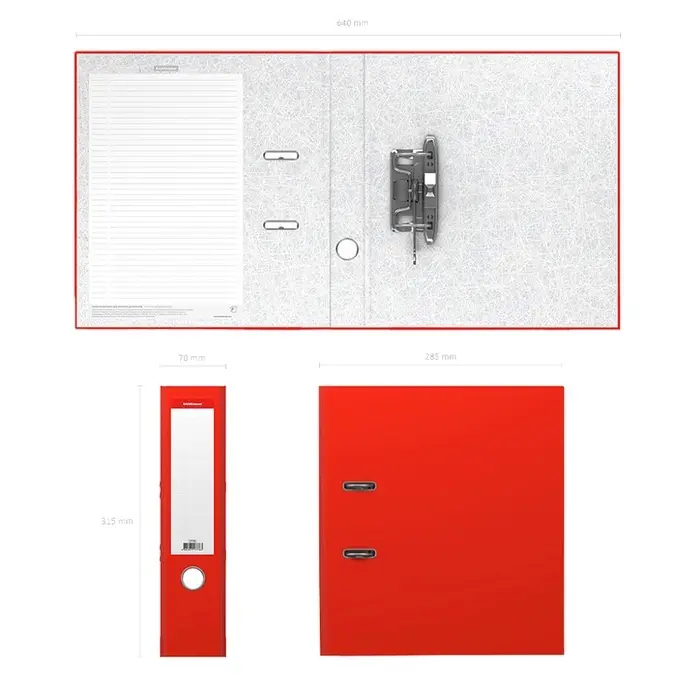 Папка - регистратор формата А4 снабжена стальным арочным механизмом с никелевым покрытием. Изготовлена из картона толщиной 1,75 мм, покрытого цветной бумагой насыщенных цветов с фактурным тиснением. На корешке шириной 70 мм изображена этикетка для маркировки. Для удобства использования на корешке имеется металлическое кольцо для захвата. Металлические фиксаторы удерживают папку в закрытом виде даже при максимальном наполнении. Вместительность 350 листов бумаги плотности 80 г/м2. На форзаце есть шаблон для оглавления. Папка предназначена для сдачи отчетной документации, последующего архивирования документов и хранения их в папке.