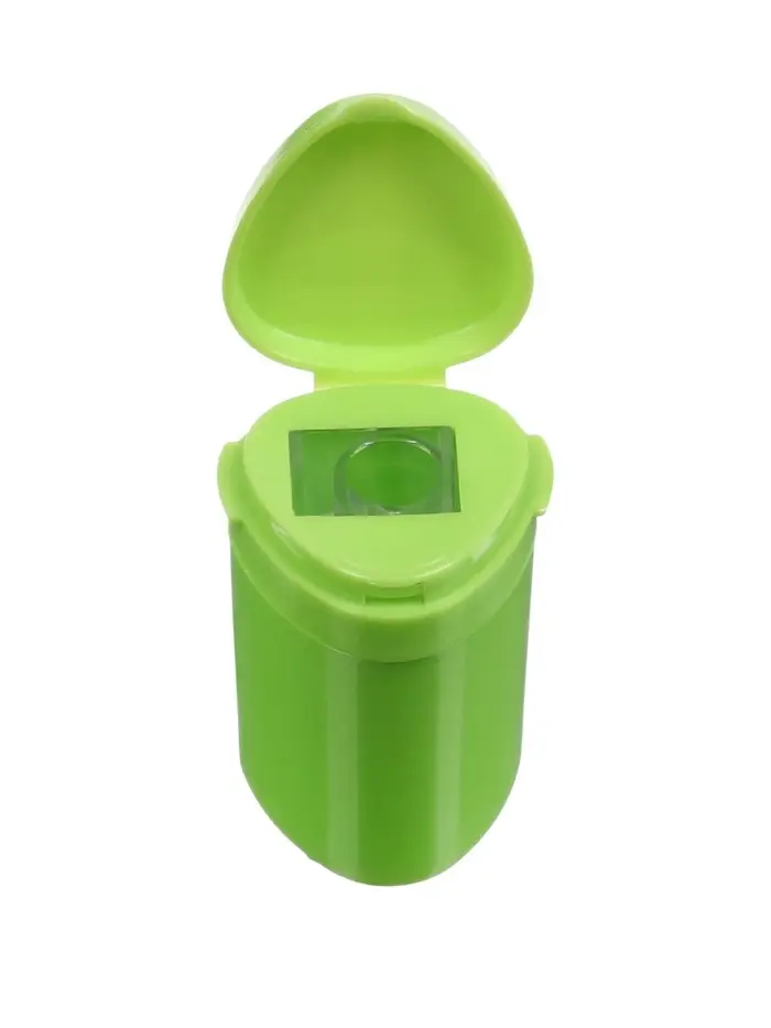Пластиковая точилка с контейнером для сбора стружки. Отверстие для заточки стандартных чернографитных и цветных карандашей диаметром 8 мм. Никелированное лезвие из углеродистой стали.