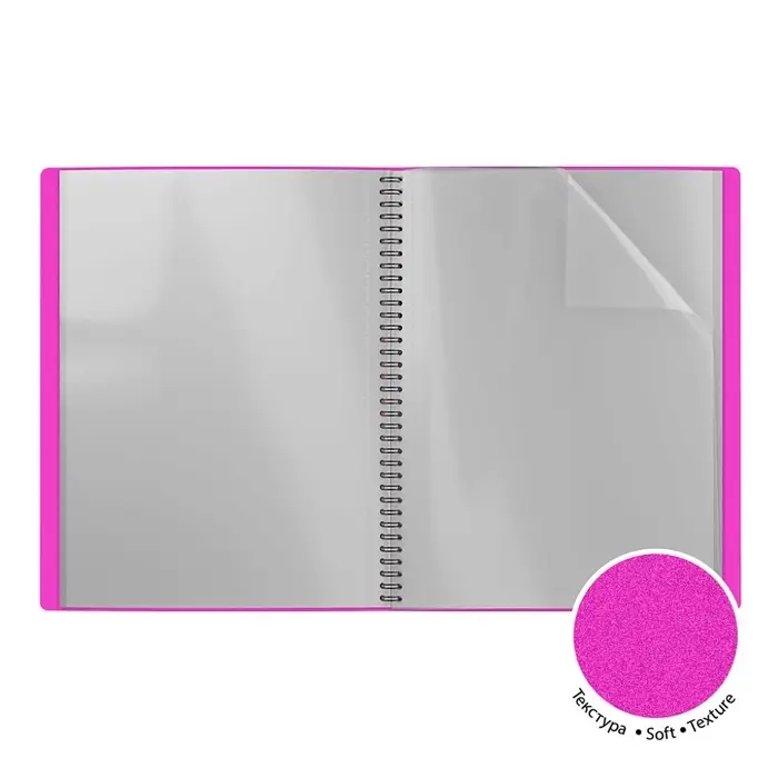 Папка файловая формата А4 из высококачественного пластика с текстурой поверхности "софт-тач", на которой не видно отпечатков пальцев и мелких царапин. Предназначена для хранения документов. Папка содержит 20 прозрачных листов-карманов, надежно скрепленных двойной евроспиралью.