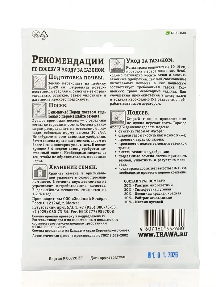 Газон Спортивный "Зеленый квадрат", 30г