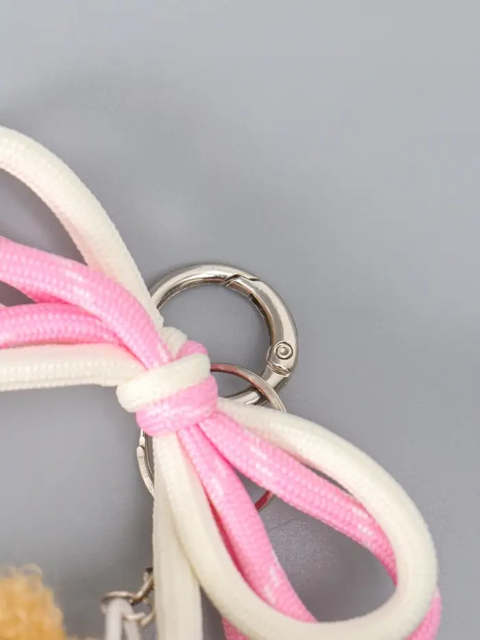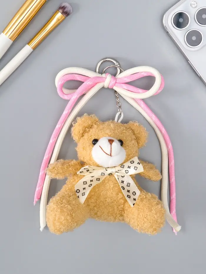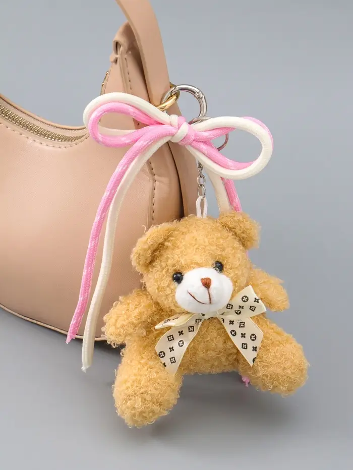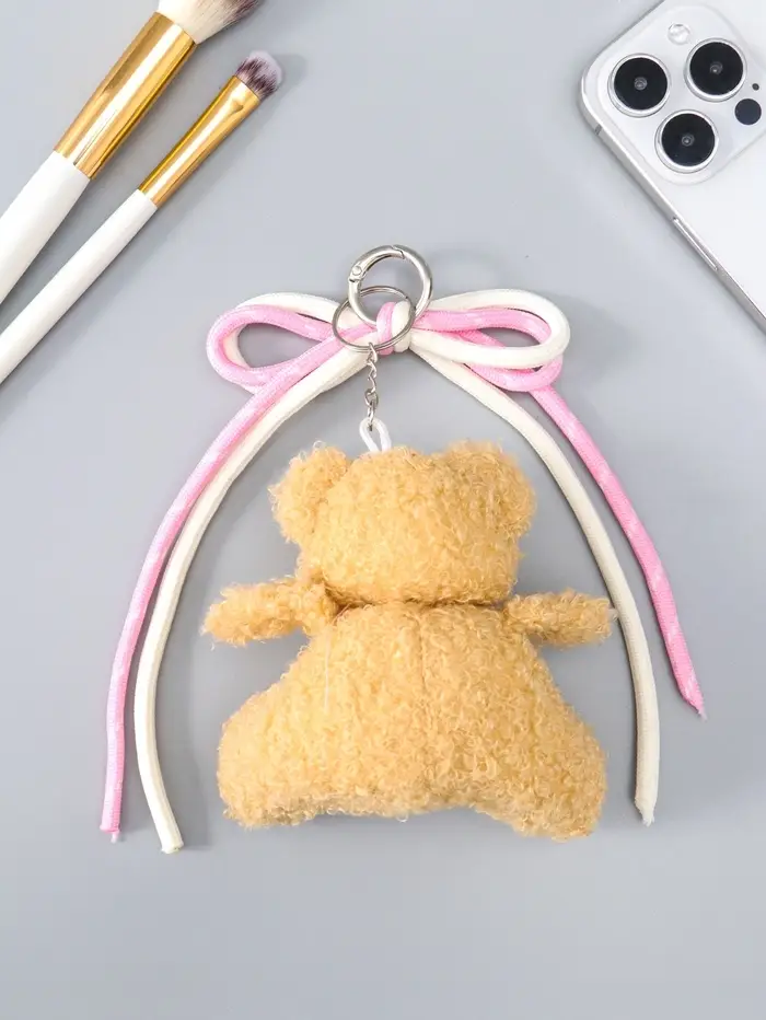 Брелок текстиль "Мишка с бело-розовым бантиком" бежевый 6х9,5х20 см
