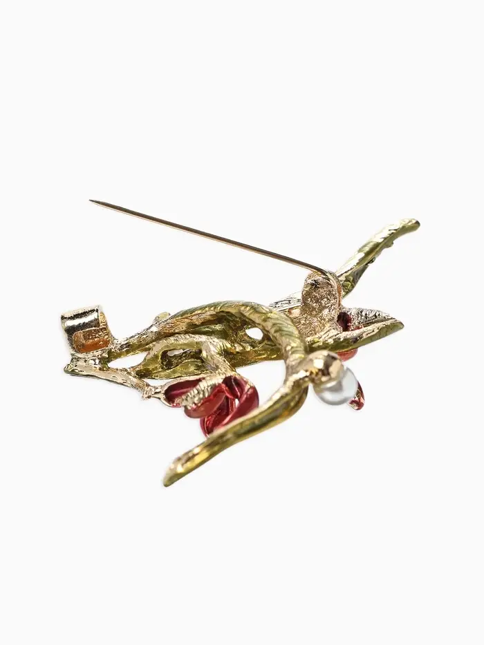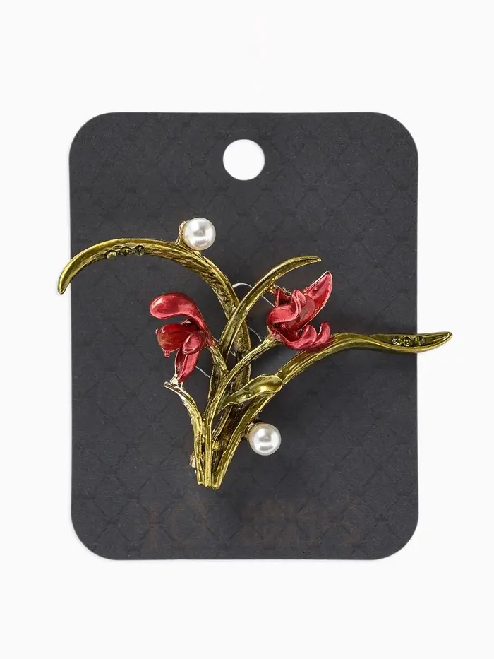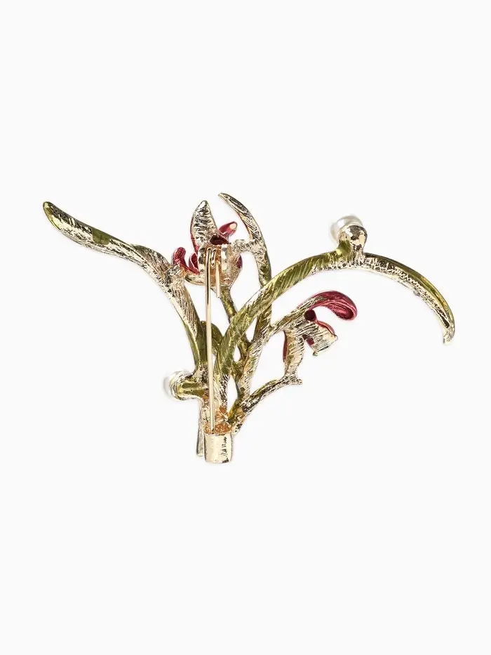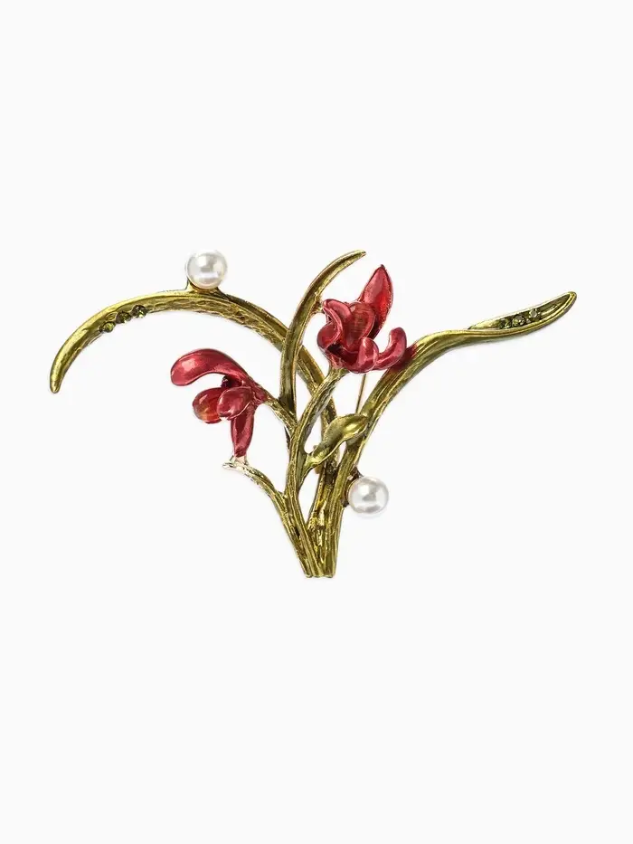 Брошь «Цветы» ирисы, жемчуг, цвет красно-зелёный