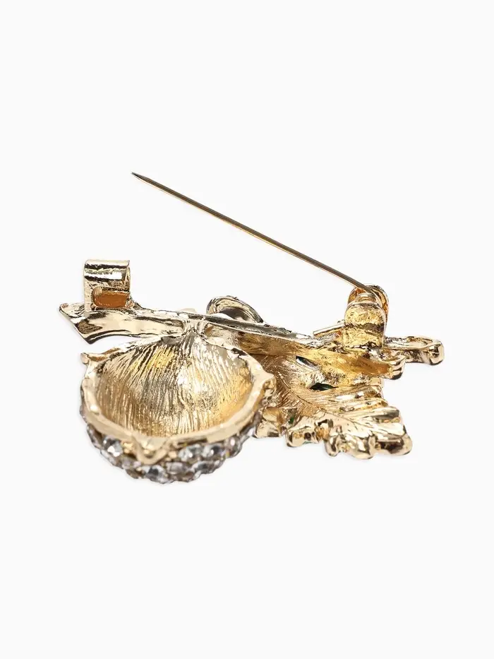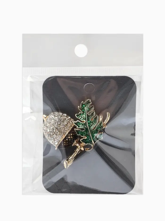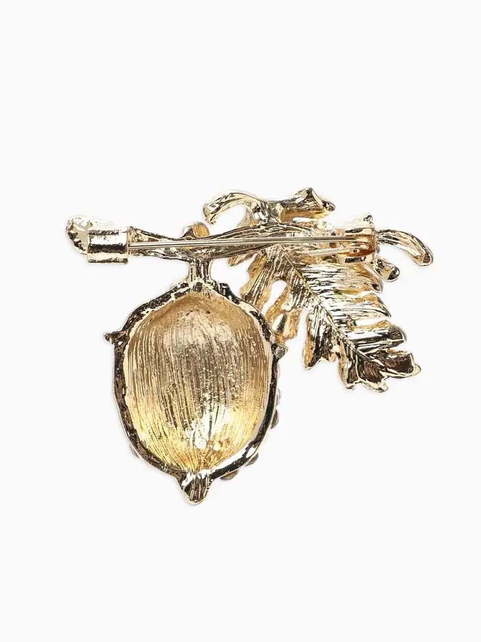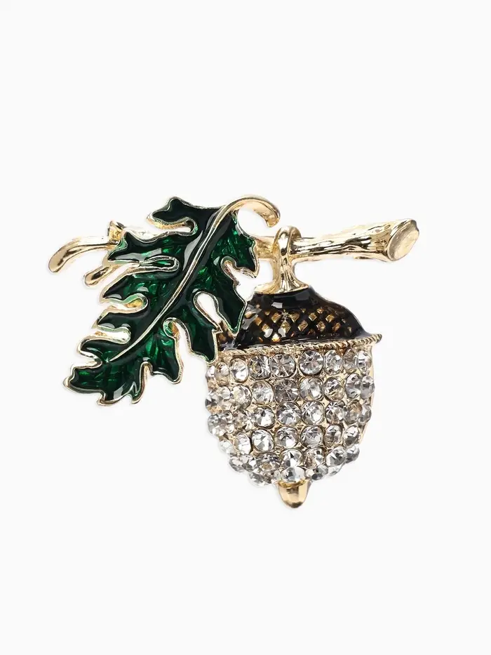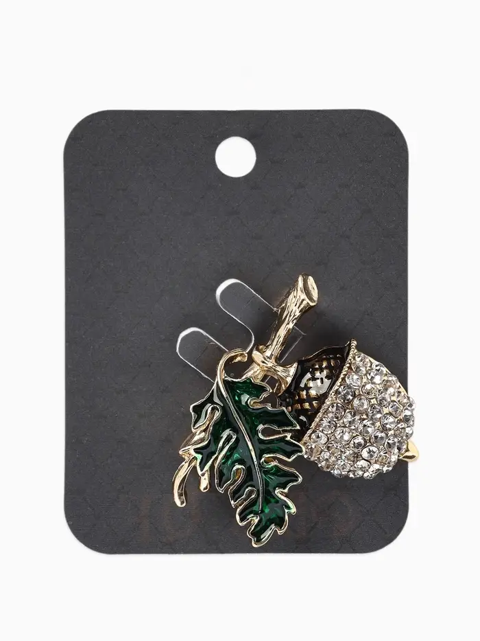 Брошь «Жёлудь» осенний с листом, стразы, цвет коичнево-бело-зелёный в золоте