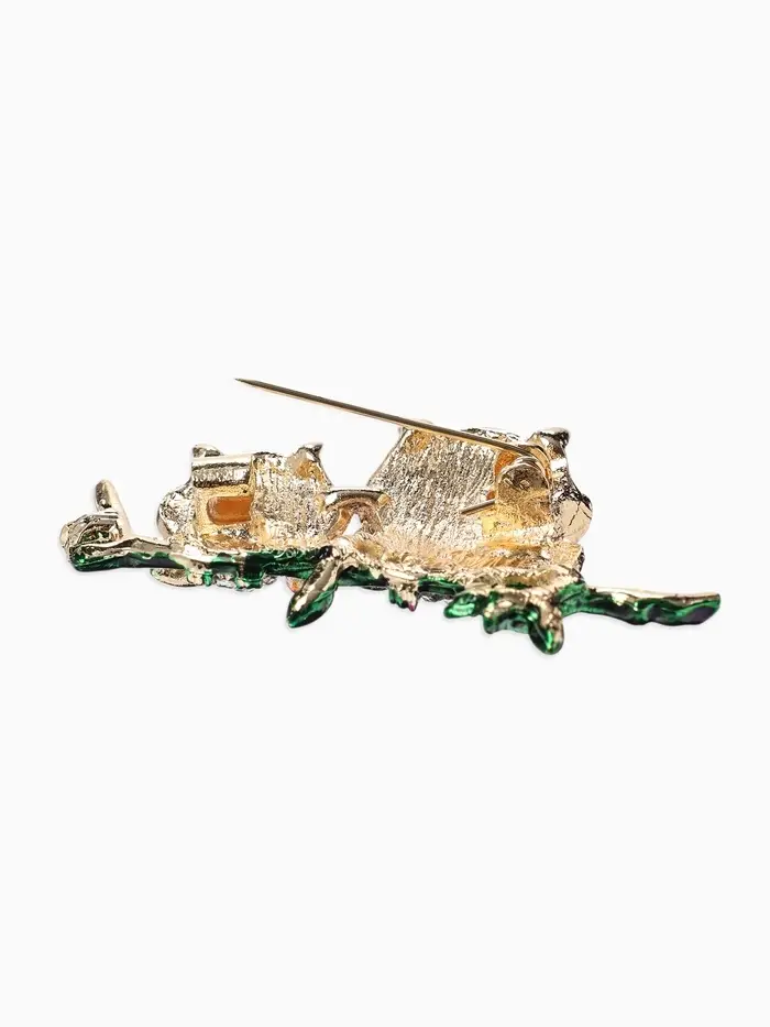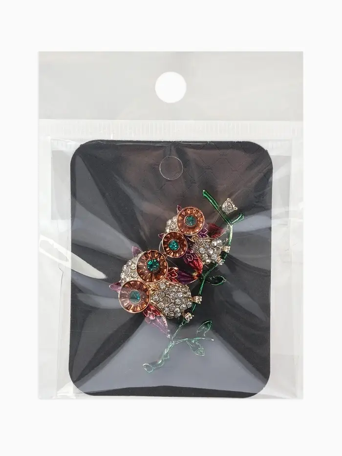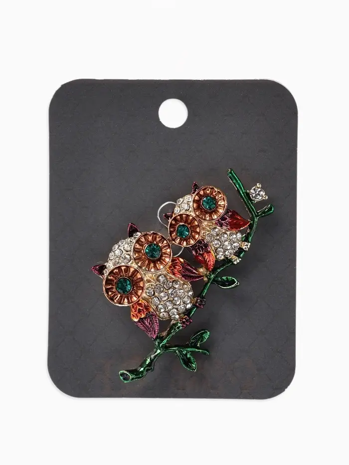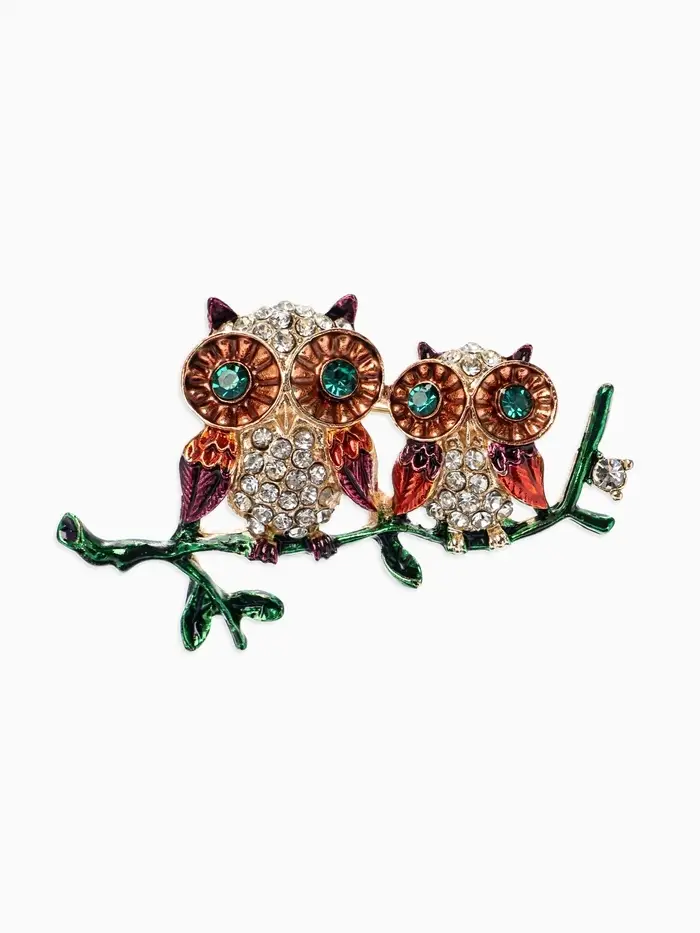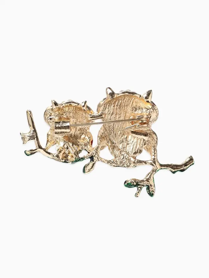 Брошь «Совы» на ветке, цветная в золоте