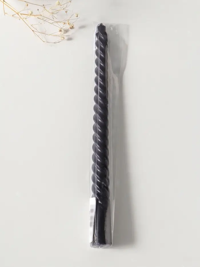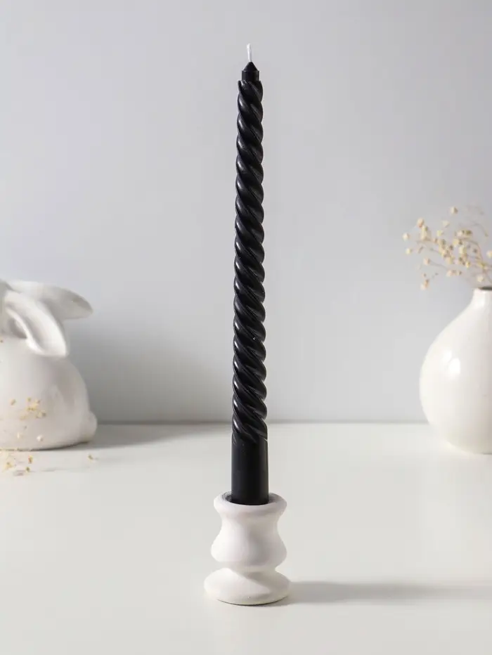 Высокая чёрная свеча с витым узором подходит для создания акцента в минималистичном интерьере, сервировки стола в стиле готик или ар-деко, а также для медитативных практик. Её длительное горение делает её практичным выбором для вечеров с книгой или неспешных бесед. Это лаконичный и самодостаточный предмет, где форма служит продолжением функции.