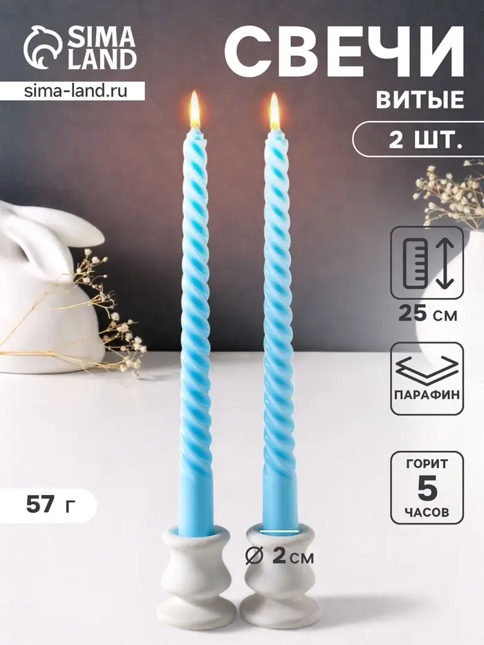 Набор свечей витых 25 см, 2 шт., 57 г, 5 ч, пастельно-голубой