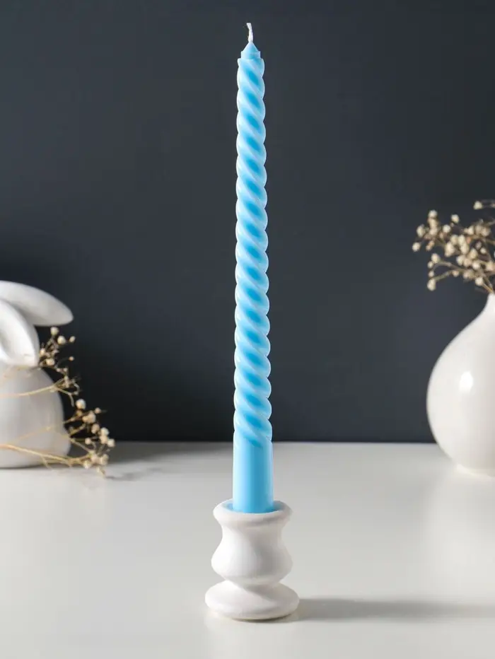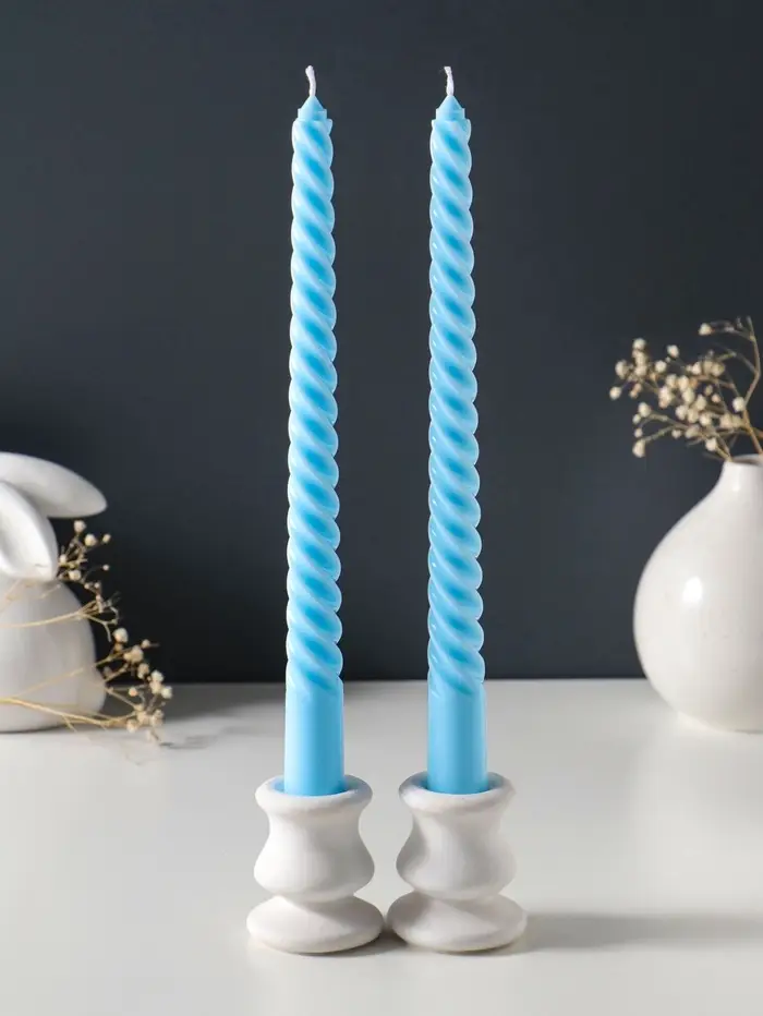 Эти высокие витые свечи создают атмосферу спокойствия и уюта. Их плавные линии и нежный пастельно-голубой оттенок напоминают закрученные шелковые ленты или лёгкий дымок. Они станут элегантным акцентом в интерьере, придавая пространству завершённость и мягкий свет.