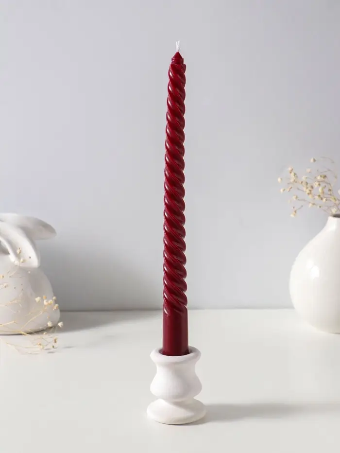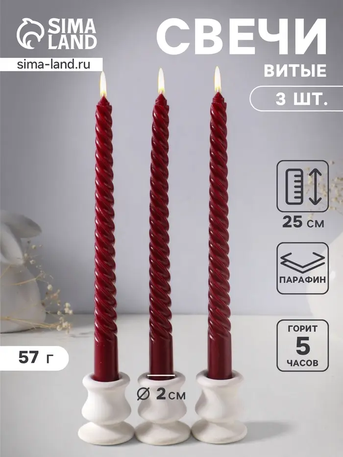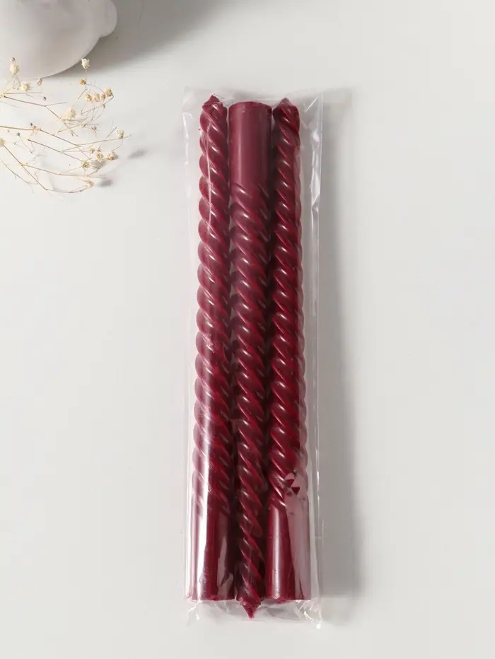 Этот набор высоких витых свечей создаёт атмосферу уюта и спокойного торжества. Три стройные свечи бордового оттенка горят ровно и долго, их пламя мягко мерцает, отбрасывая живые тени. Идеальный акцент для романтического ужина, медитации или оформления интерьера в винтажном стиле.