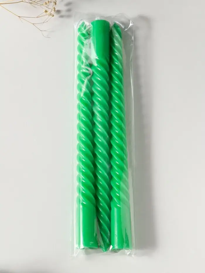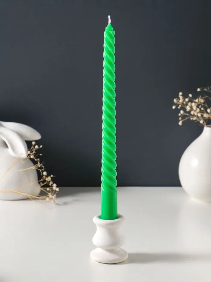 Длинные витые свечи — это готовый акцент для каминной полки, обеденного стола или уютного уголка. Их зелёный цвет привносит ноту природной свежести, а естественная форма добавляет интерьеру динамики. Зажгите одну или все три вместе, чтобы превратить обычный вечер в небольшой ритуал отдыха и красоты.