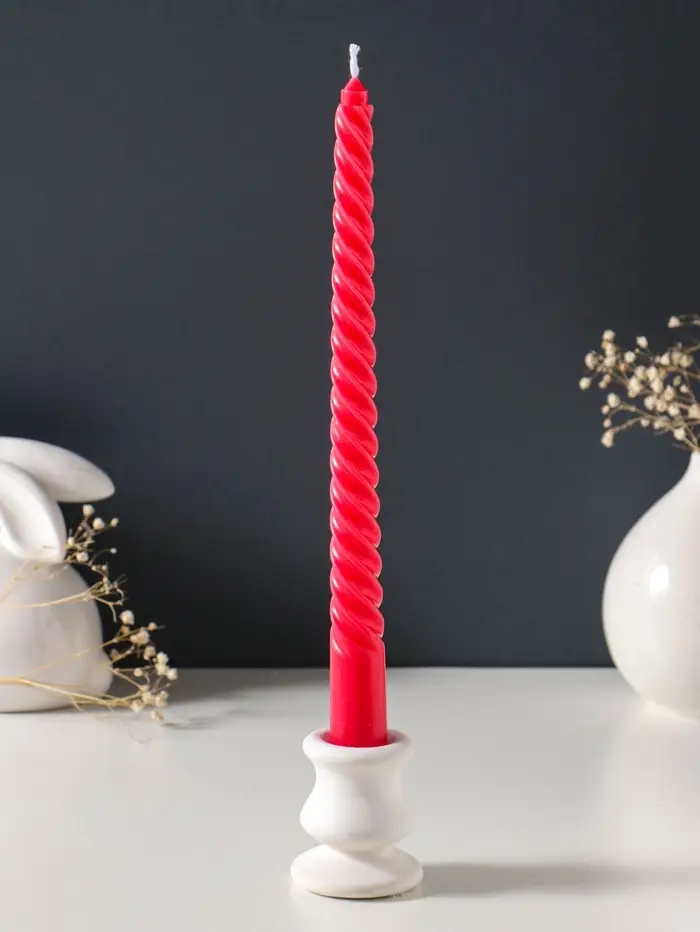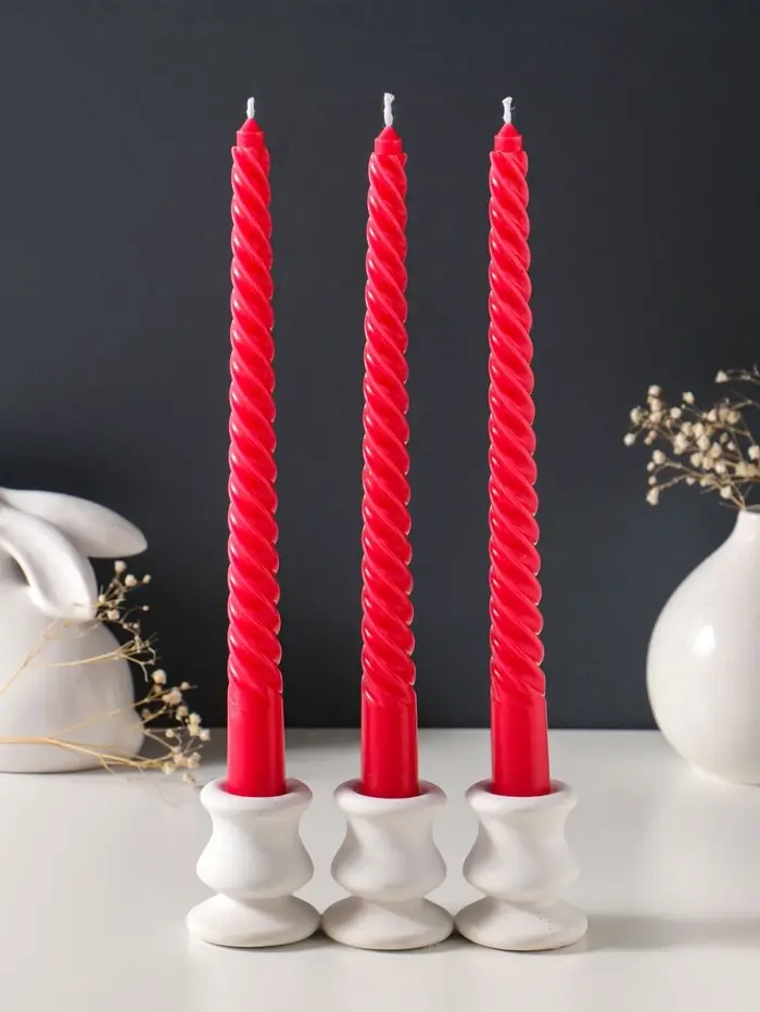 Набор из трёх высоких витых свечей создаёт атмосферу уюта и торжества. Их плавный, гибкий силуэт напоминает застывшее пламя или изящную ленту. Горит ровно и долго, наполняя пространство мягким, живым светом.