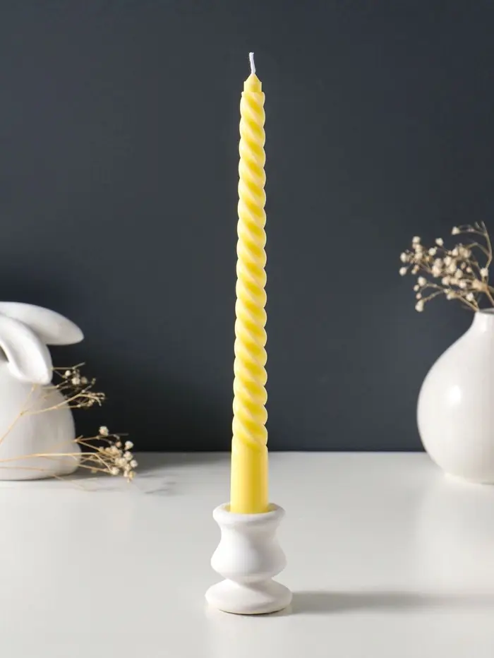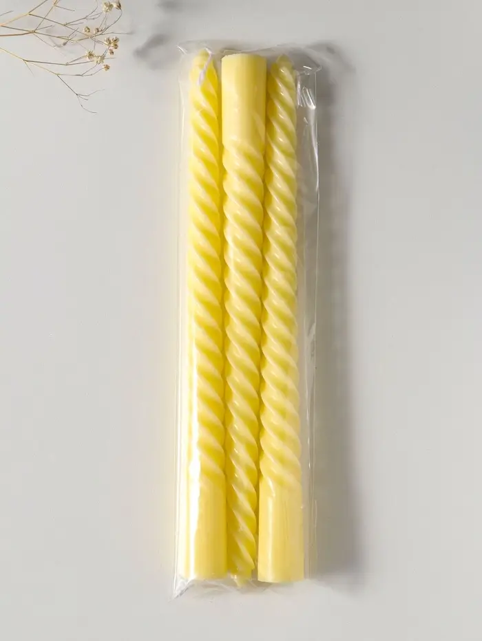 Этот набор из трёх высоких свечей — готовое решение для создания атмосферы. Тонкие витые столбики пастельно-жёлтого цвета придают интерьеру лёгкость и тёплое свечение. Они горят до пяти часов, постепенно раскрывая игру пламени и мягкий свет.