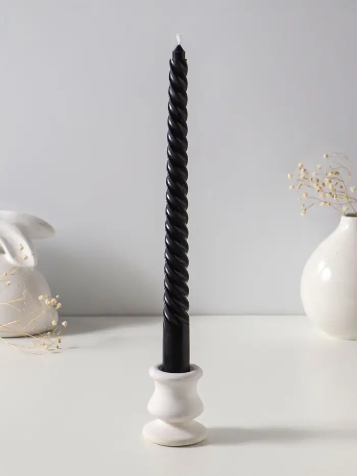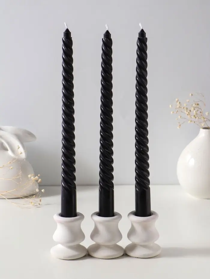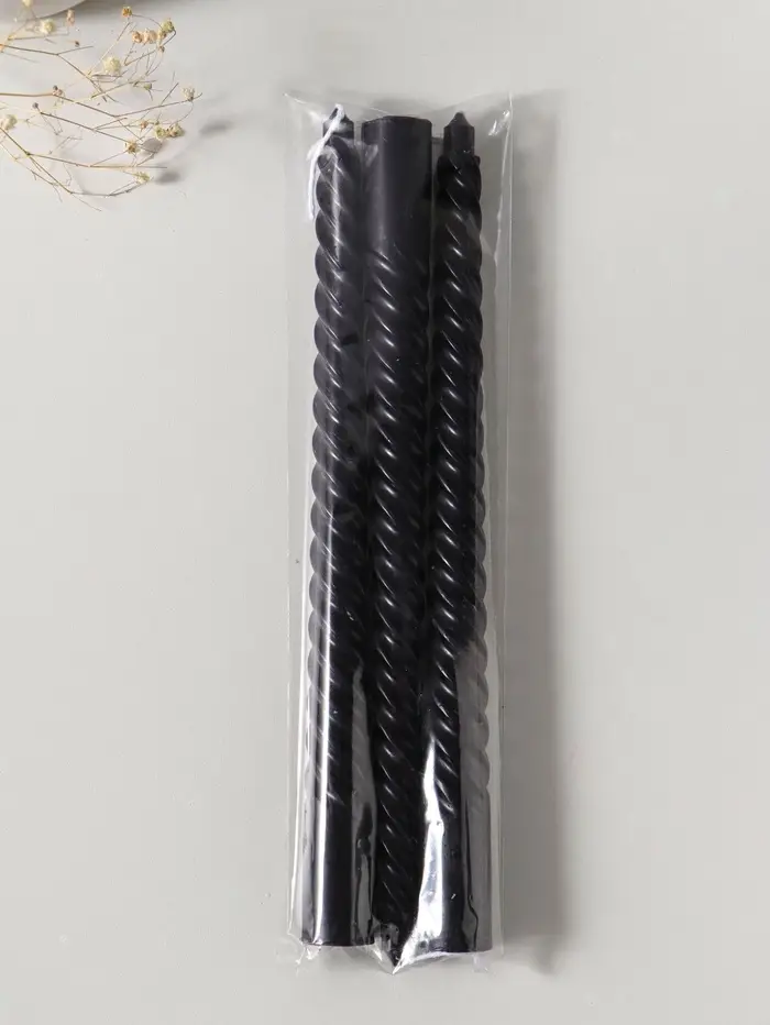 Этот набор из трёх высоких витых свечей — готовое решение для создания атмосферы. Их строгий чёрный цвет и изящная спиральная форма добавляют интерьеру графичный акцент и динамику даже в неподвижном состоянии. Когда вы их зажжёте, пламя, танцующее вдоль витков, будет отбрасывать живые, мерцающие тени, наполняя пространство уютом и завораживающим световым рисунком.
