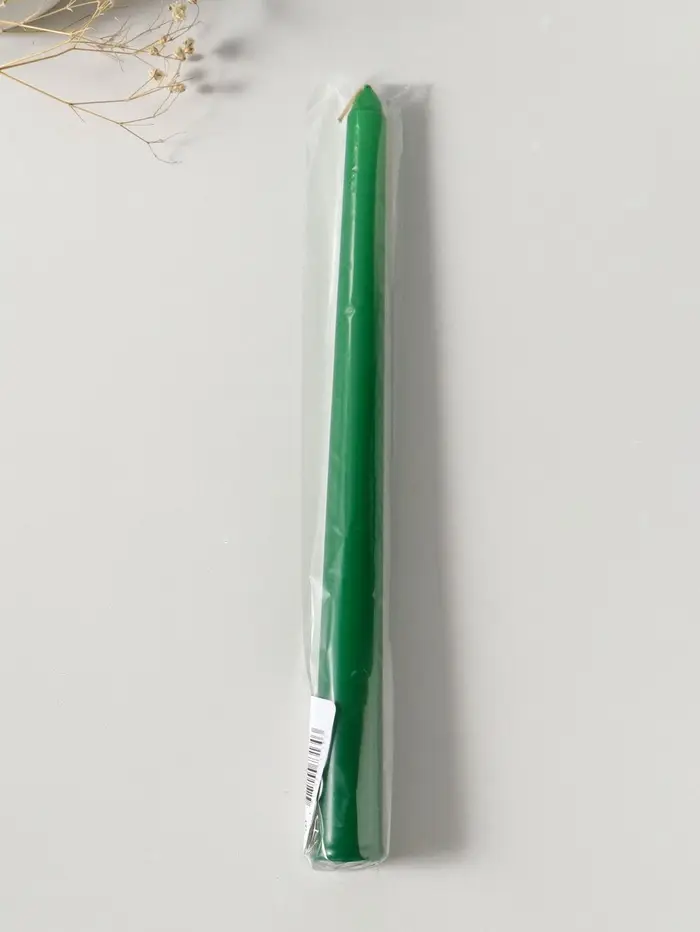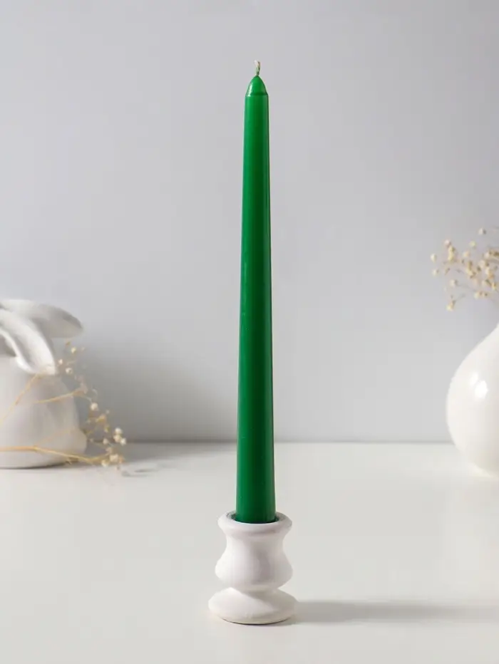 Эта высокая зелёная свеча создаёт в комнате атмосферу спокойствия и уединения. Её стройный силуэт и глубокий оттенок зелени напоминают о тишине старинного парка или благородстве малахита. Свеча горит до семи часов, постепенно раскрывая свою палитру — от яркого изумрудного пламени до тёплого медового света фитиля.
