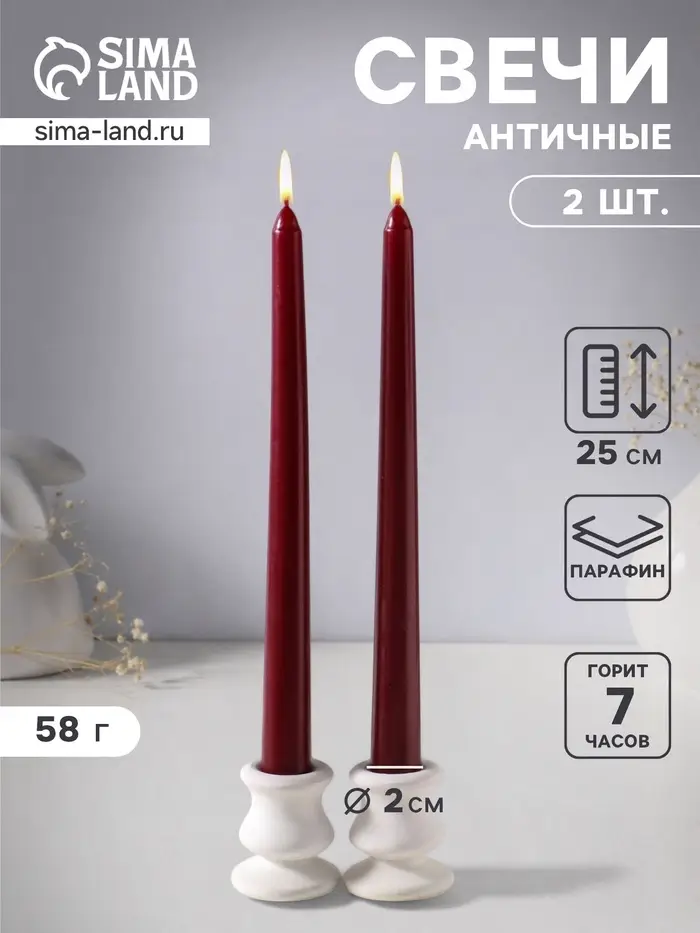 Набор свечей античных 25 см, 2 шт., 58 г, 7 ч, бордовый