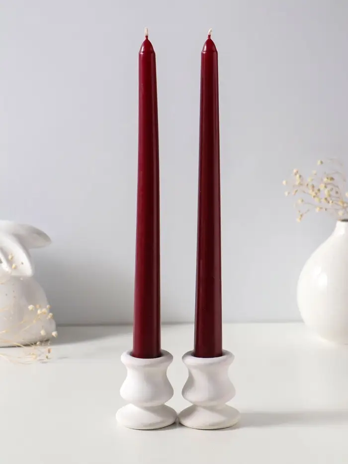Этот набор из двух высоких бордовых свечей создаёт атмосферу уединённого спокойствия и классической эстетики. Их стройный силуэт и глубокий оттенок придают интерьеру особый шарм, превращая обычный вечер в момент тихой роскоши. Идеальное решение для создания интимной обстановки во время ужина или как элемент декора в гостиной.