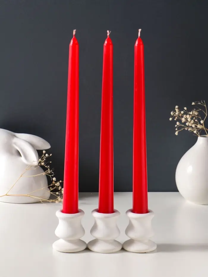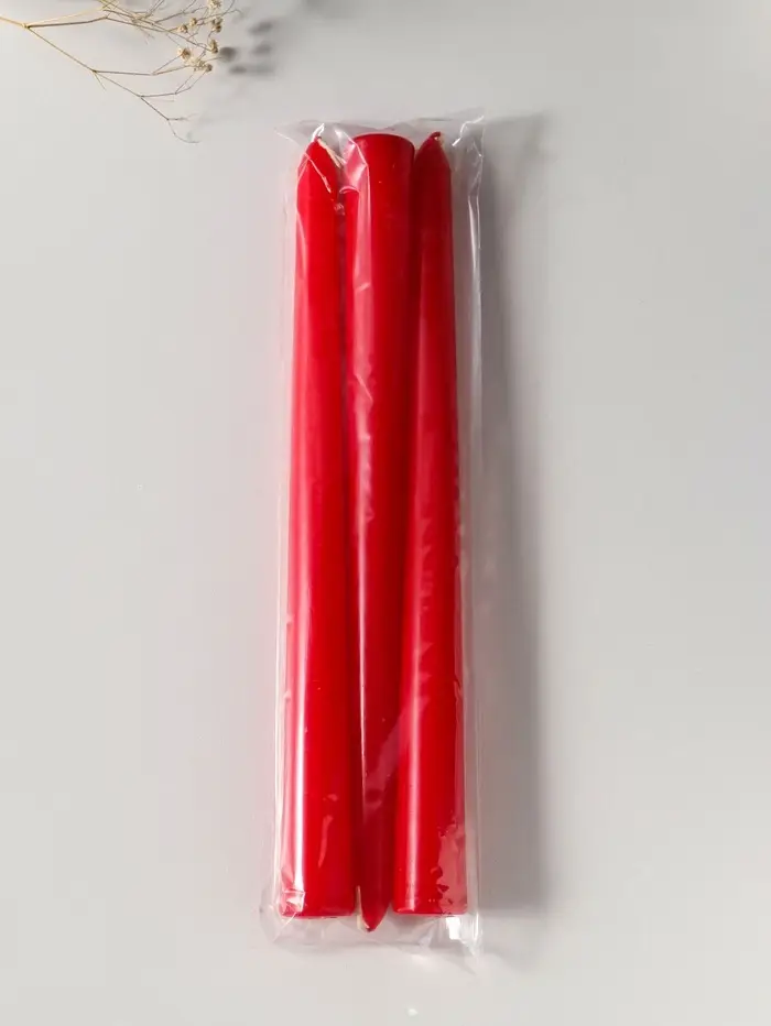 Набор из трёх высоких красных свечей создаёт атмосферу уюта и торжественности. Их стройный силуэт и насыщенный цвет станут изящным акцентом в интерьере, а тёплый живой свет подарит спокойствие после долгого дня.