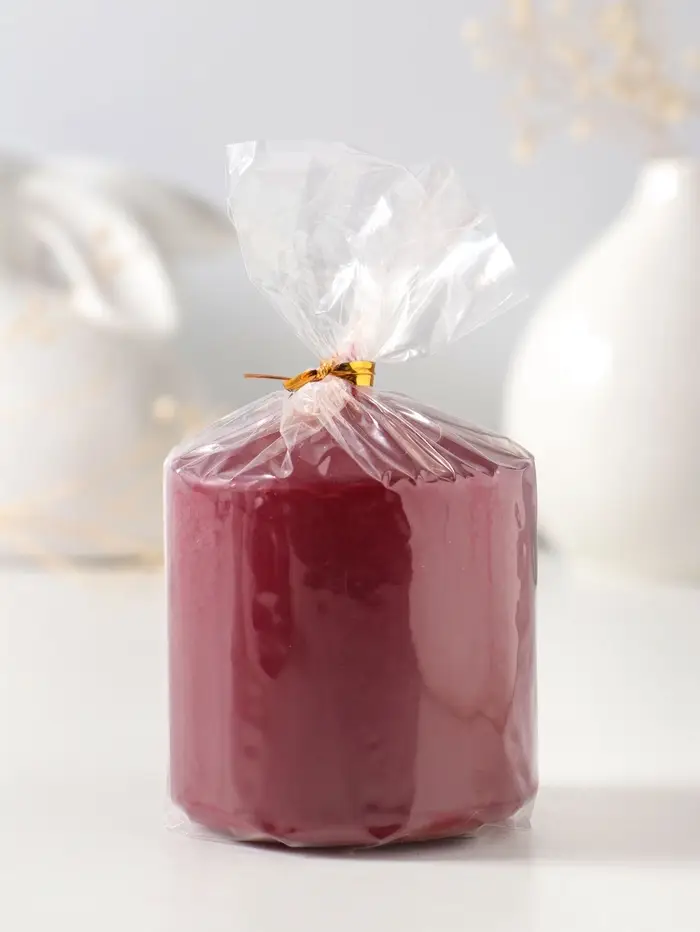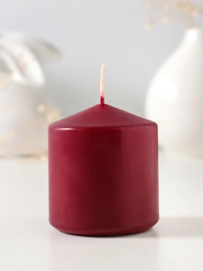 Бордовая цилиндрическая свеча создаёт атмосферу уюта и торжества. Её классическая форма и насыщенный глубокий цвет подходят для любого повода — от романтического ужина до праздничного стола на 8 Марта. Свеча стабильна и долго горит, наполняя пространство мягким, тёплым светом.