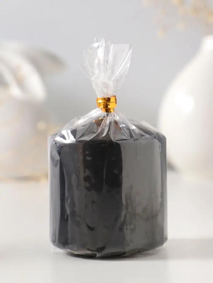 Чёрная парафиновая свеча служит стильным элементом декора. Её пламя мягко рассеивает свет, добавляя глубины и акцента в обстановку. Такой цилиндр легко вписывается в сдержанный современный интерьер или становится ключевой деталью в оформлении Хэллоуина. Простая и элегантная, она не отвлекает, а дополняет вашу идею.