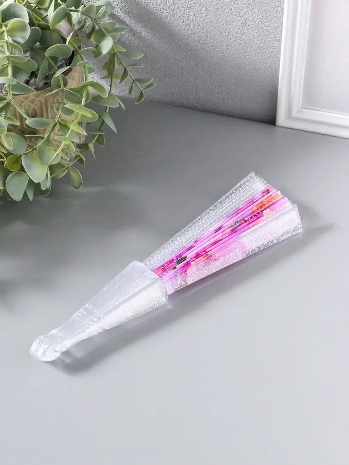 Этот складной веер с цветочным узором — лёгкий и прохладный аксессуар для жарких дней. Его пластиковые лепестки напоминают полупрозрачные крылья бабочки, а нежный розовый блеск добавляет образу изящества. Веер компактно складывается, его удобно брать с собой в сумочке на прогулку, в театр или на летнее мероприятие.