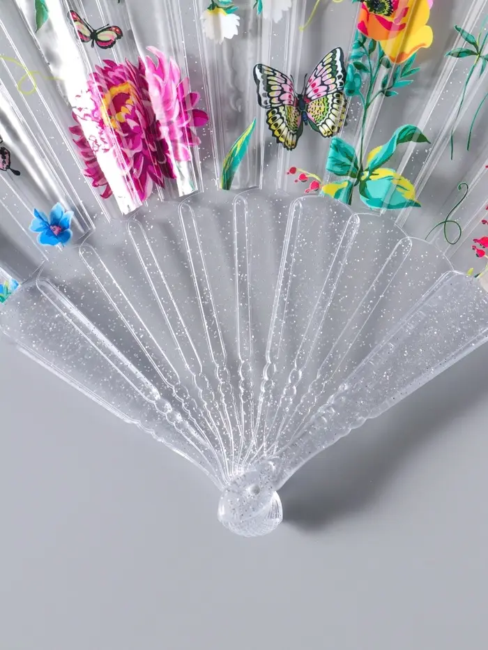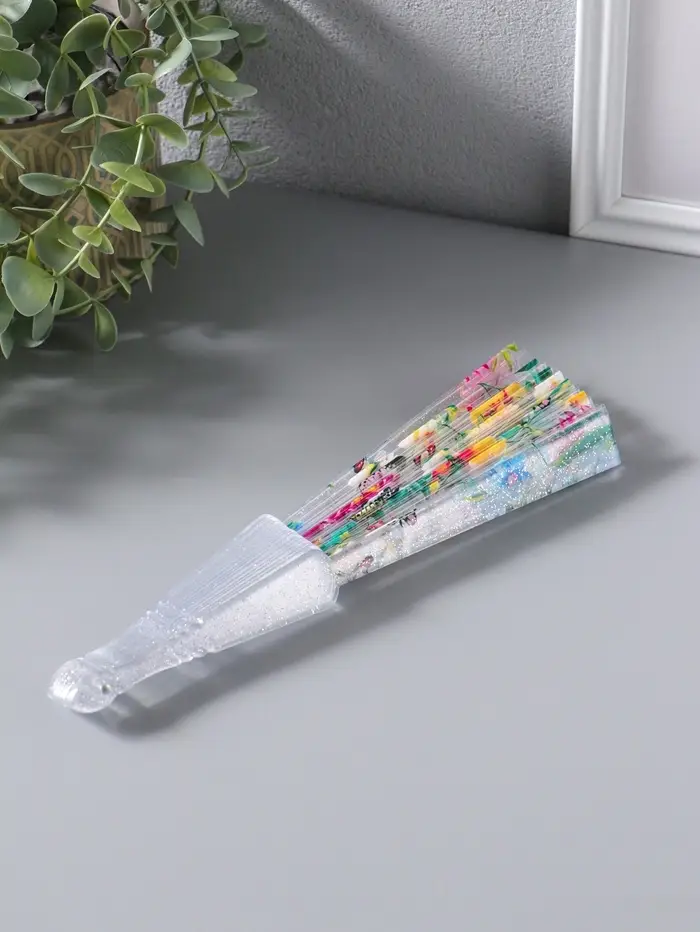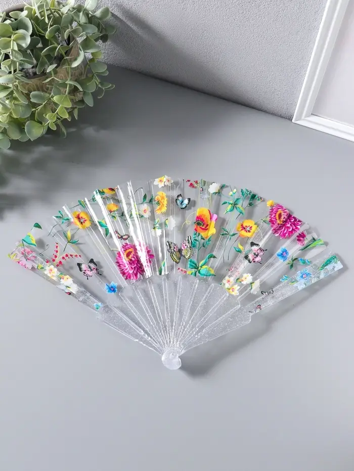Этот складной веер из пластика — лёгкий и яркий спутник для жарких дней. Его прозрачные лопасти с цветочным узором создают приятную прохладу и игривые блики света. Компактный размер делает его идеальным для прогулок в парке, поездок на дачу или посещения летних фестивалей.