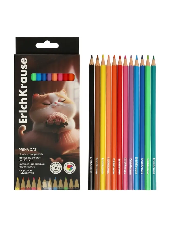 Карандаши 12 цветов, ErichKrause Prima Cat, пластиковые, шестигранные