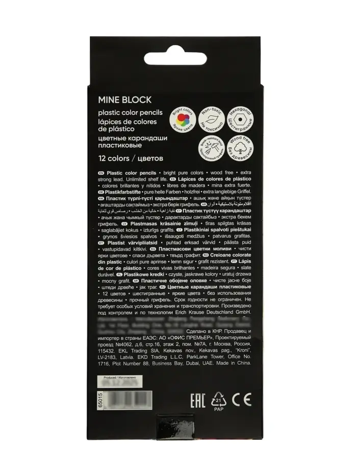 Пластиковые цветные карандаши представлены в яркой палитре из 12 цветов. Благодаря шестигранной форме, карандаши удобно лежат в руке и не скатываются с поверхности. Специальная технология изготовления карандаша методом экструзии надежно фиксирует грифель к корпусу, что обеспечивает высокую ударопрочность. Идеальная центровка грифеля и пластичность материала карандаша гарантирует легкую заточку с экономным расходом карандаша. Грифель диаметром 2.6 мм не ломается и не крошится даже при сильном нажиме.