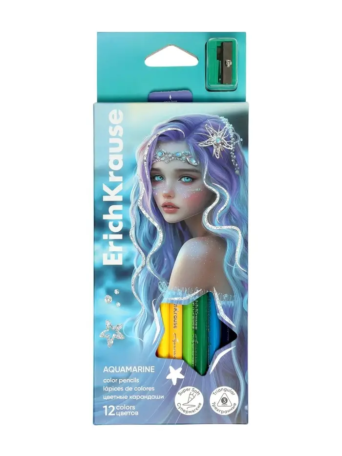 Карандаши 12 цветов, ErichKrause Aquamarine, пластиковые, трехгранные, с точилкой