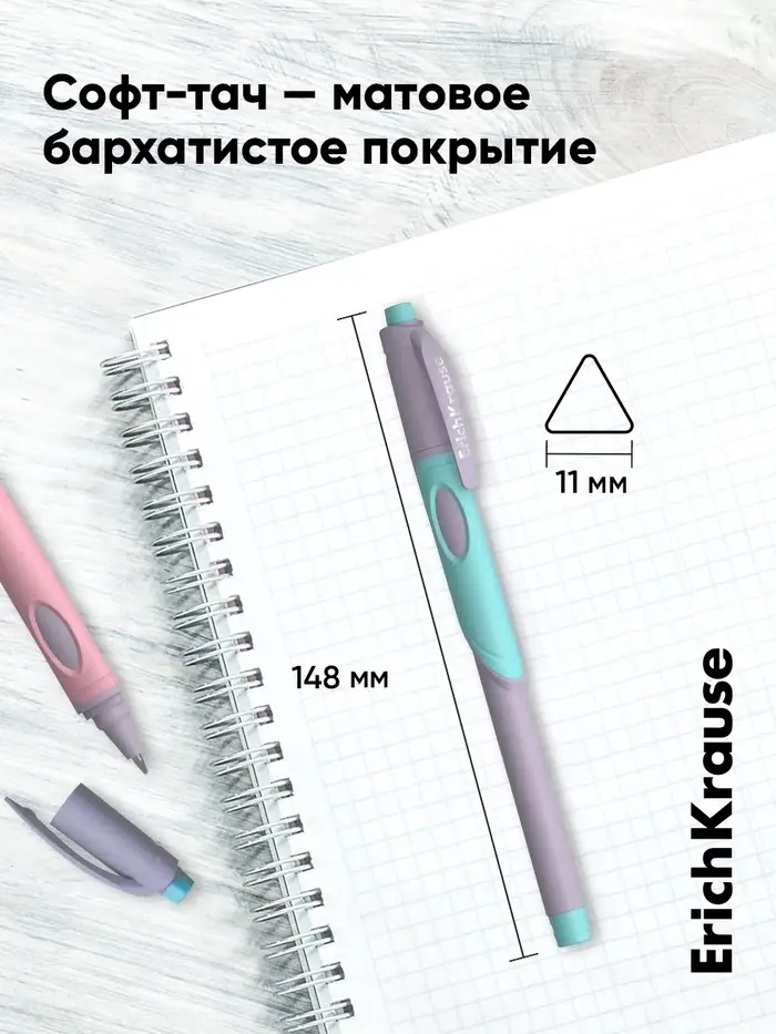 Эргономичная шариковая ручка Stick&Grip с покрытием Soft Touch, стандартным типом пишущего узла, заменяемым стержнем увеличенного объема и уникальной технологией Super Glide. Ручка имеет непрозрачный матовый круглый корпус нежных пастельных цветов, треугольную эргономичную грип-зону с выемками для пальцев и вентилируемый колпачок. 5-канальный пишущий узел с диаметром шарика 0.5 мм в сочетании с чернилами пониженной вязкости обеспечивает мягкое и быстрое письмо без усилий. Благодаря увеличенному резервуару стержня длина непрерывной линии составляет 2000 м при толщине 0.25 мм, что является одним из лучших показателей в своей категории.