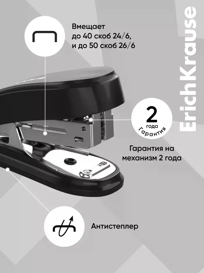Степлер со встроенным антистеплером изготовлен из ударопрочного пластика с высококачественным стальным механизмом. Вмещает до 40 скоб 24/6, до 50 скоб 26/6. Пробивает до 15 листов. Глубина закладки бумаги до 25 мм.