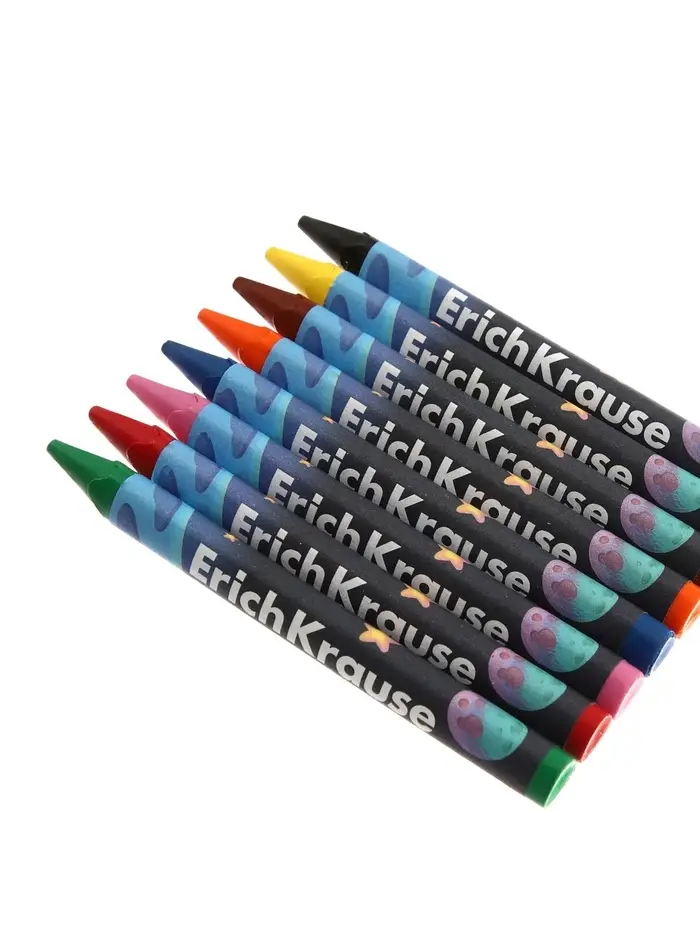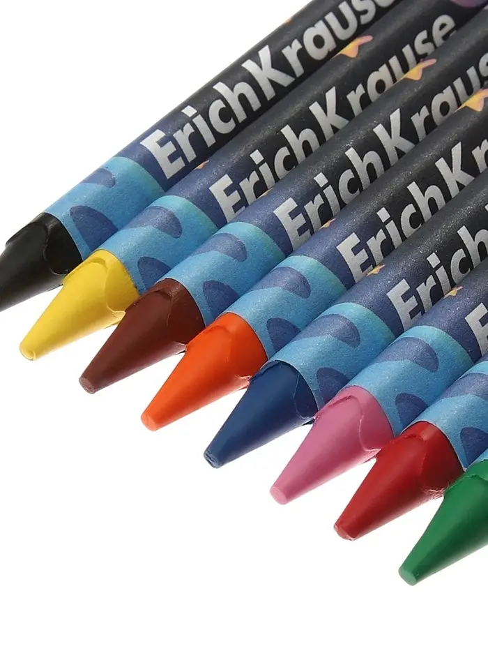 Экстрамягкие восковые мелки для детей. Корпус трехгранный диаметром 8 мм, предварительно заточен, обернут в бумагу, устойчив к поломкам. Подходят для рисования на разных поверхностях, прекрасно ложатся на бумагу, картон и дерево. Рисунки со временем не теряют яркости.