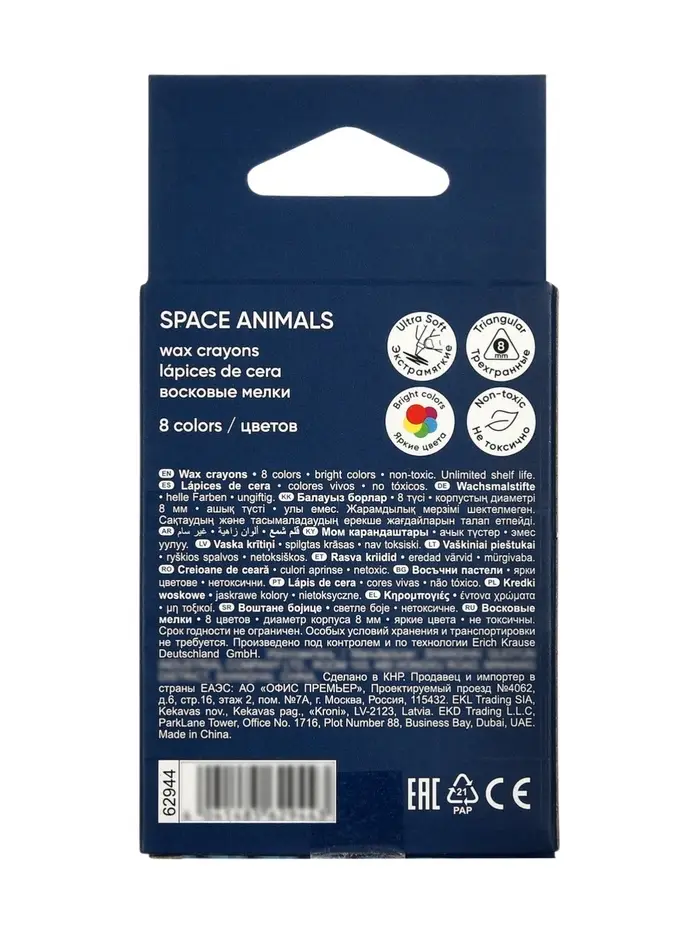 Восковые мелки 8 цветов, ErichKrause Kids Space Animals, трёхгранные