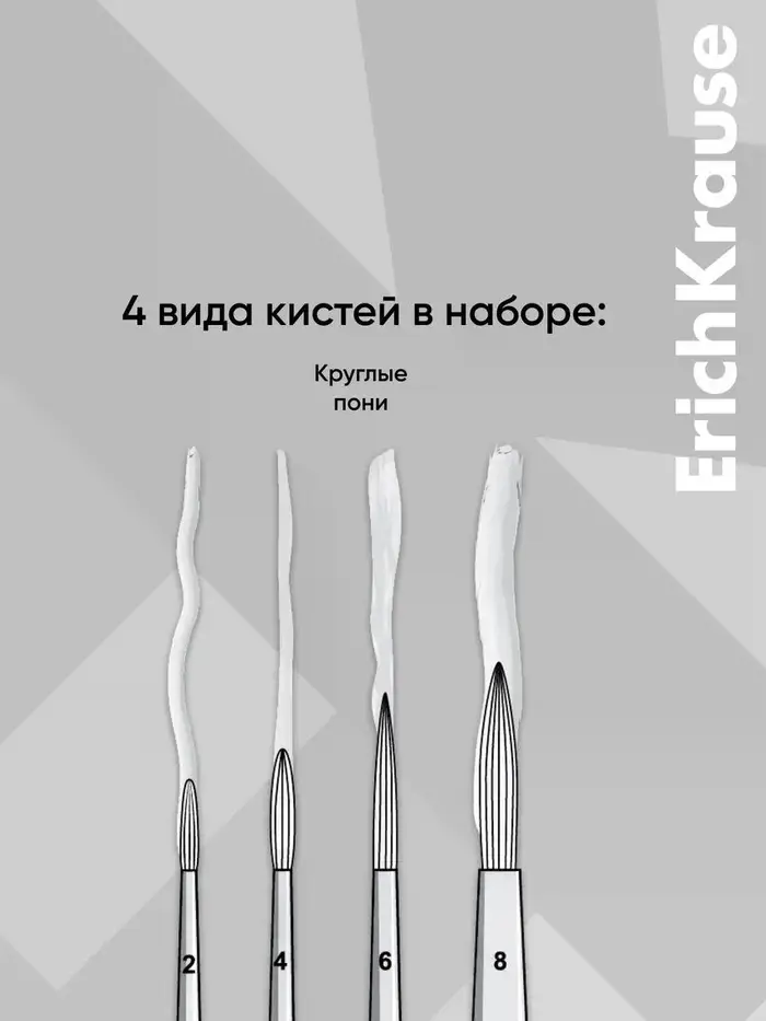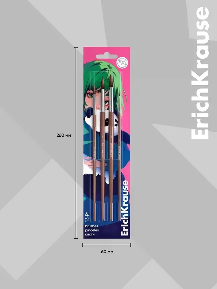 Кисти ErichKrause в коллекции Panda Hugs для для детского творчества и школьных работ. Изготовлены из натурального волоса пони, поэтому хорошо впитывают краску и держат форму. Рабочая часть кисти обработана составом, который защищает при хранении и транспортировке. Ручка из натурального дерева покрыта защитным лаком. Цельнометаллическая бесшовная обойма из алюминия не ржавеет. В наборе кисти круглые № 2, 4, 6, 8.