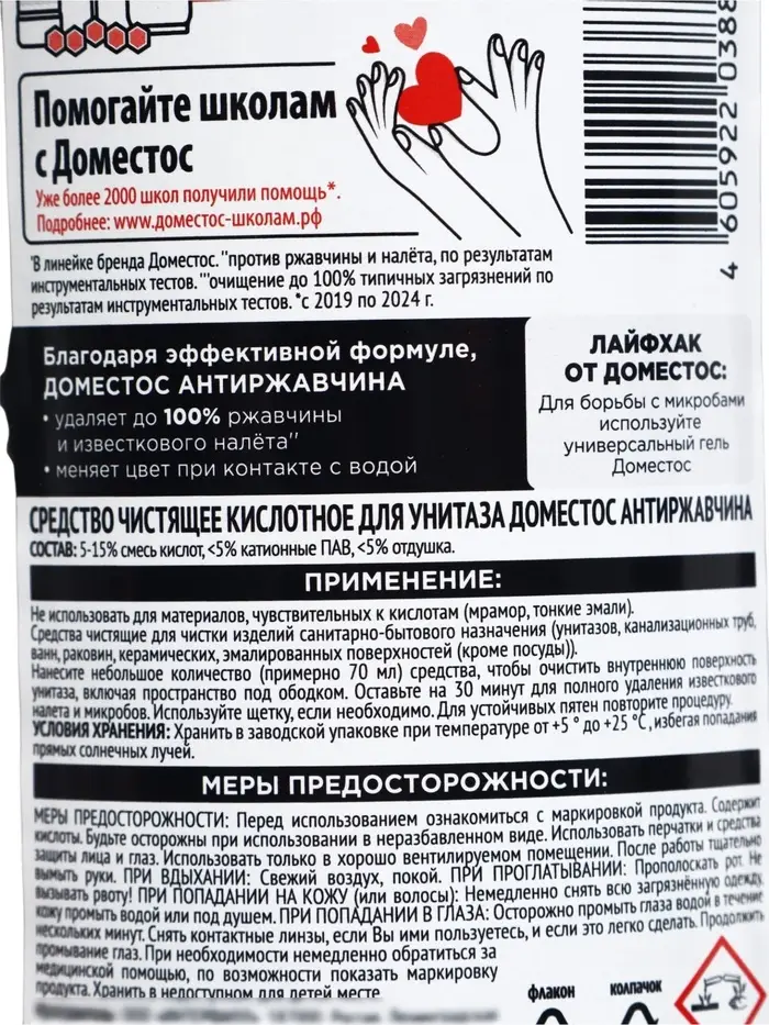 Чистящее средство для унитаза ДОМЕСТОС антиржавчина, 750 мл