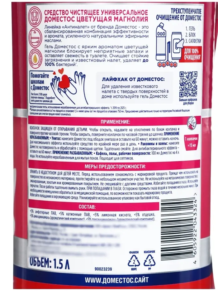 DOMESTOS «Антиналет + Блеск» «Цветущая магнолия» — это универсальное чистящее средство, разработанное для эффективного удаления известкового налёта, мыльных отложений и повседневных загрязнений в ванной комнате и других помещениях. Оно помогает не только очищать поверхности, но и придавать им заметный блеск и ухоженный внешний вид.