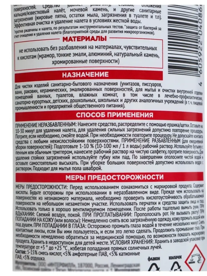 Использовать только на кислотостойких поверхностях. Не смешивать с хлорсодержащими средствами. Избегать попадания на кожу и в глаза. Работать в перчатках и в проветриваемом помещении. При попадании — немедленно промыть большим количеством воды. Хранить в недоступном для детей месте.