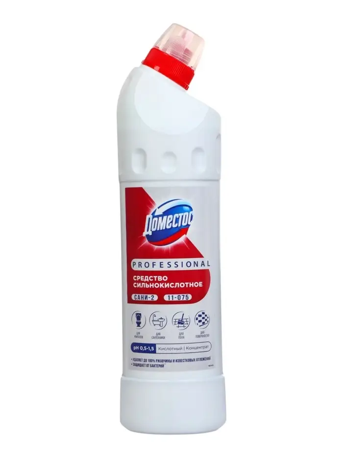 Сильнокислотное чистящее средство Domestos — это мощный специализированный продукт для глубокой очистки и удаления сложных минеральных загрязнений в ванной комнате и туалете. Оно эффективно справляется с известковым налётом, ржавчиной, мочевым камнем и другими стойкими отложениями, возвращая поверхностям чистоту, гладкость и гигиеническую свежесть.