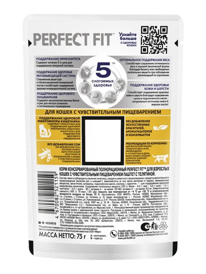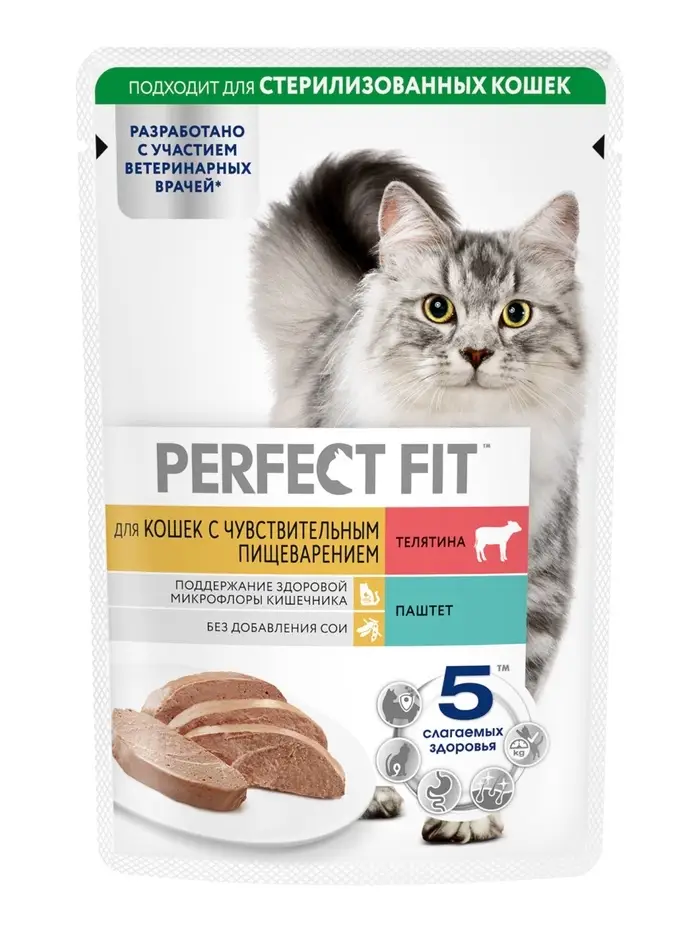 Влажный рацион PERFECT FIT™ паштет с телятиной для кошек с чувствительным пищеварением содержит пребиотики, способствующие поддержанию здоровой микрофлоры кишечника питомца. Здоровая микрофлора кишечника - Содержит пребиотики для поддержания здоровой микрофлоры кишечника Без добавления сои - Без добавления сои, которая может быть причиной расстройств пищеварения у кошек с чувствительным пищеварением.