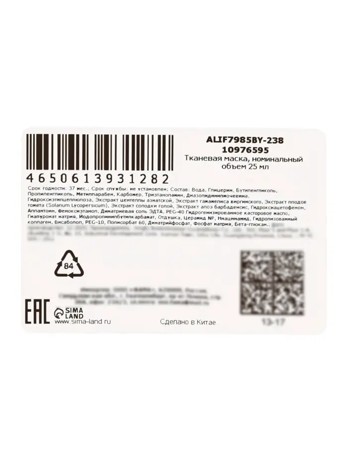 Вода, Глицерин, Бутиленгликоль, Пропиленгликоль, Метилпарабен, Карбомер, Триэтаноламин, Диазолидинилмочевина, Гидроксиэтилцеллюлоза, Экстракт центеллы азиатской, Экстракт гамамелиса виргинского, Экстракт плодов томата (Solanum Lycopersicum), Экстракт солодки голой, Экстракт алоэ барбаденсис, Гидроксиацетофенон, Аллантоин, Феноксиэтанол, Динатриевая соль ЭДТА, PEG-40 Гидрогенизированное касторовое масло, Гиалуронат натрия, Йодопропинилбутилкарбамат, Отдушка, Церамид NP, Ниацинамид, Гидролизованный коллаген, Бисаболол, PEG-10, Полисорбат 60, Динатрийфосфат, Фосфат натрия, Бета-глюкан.