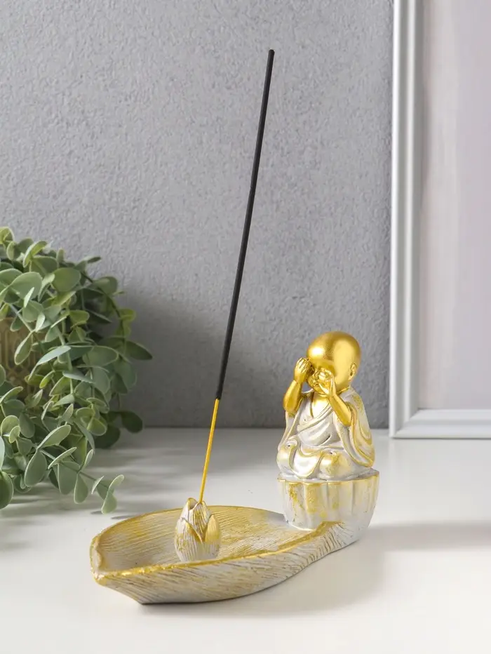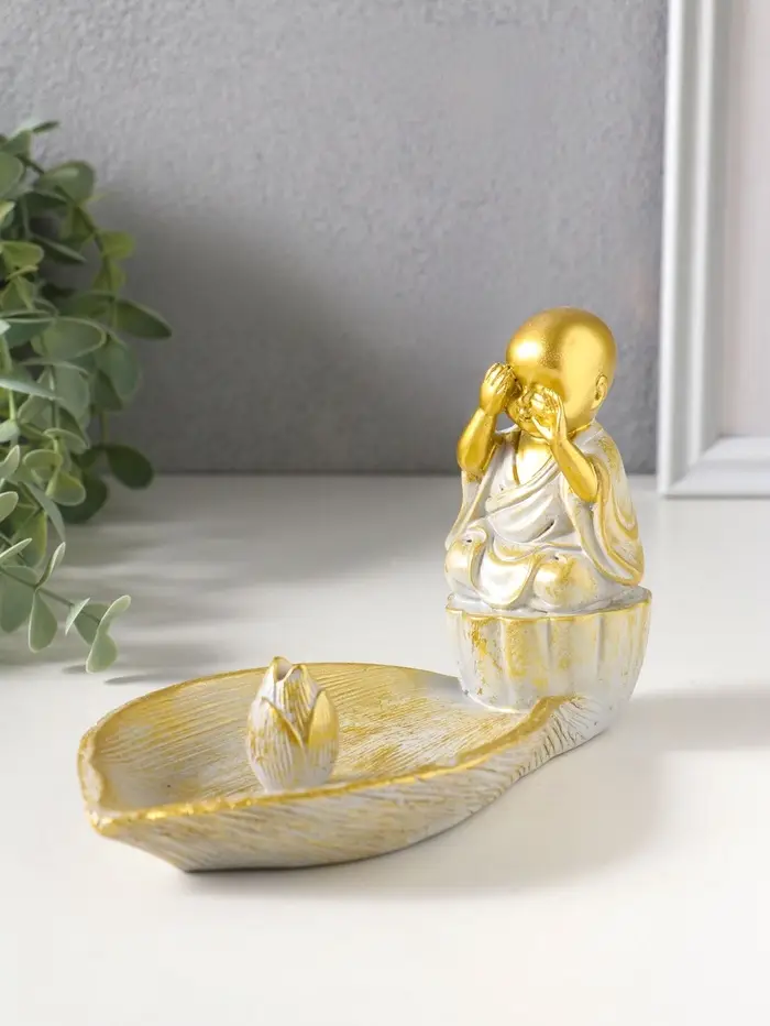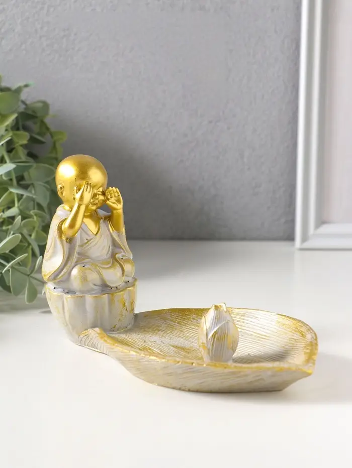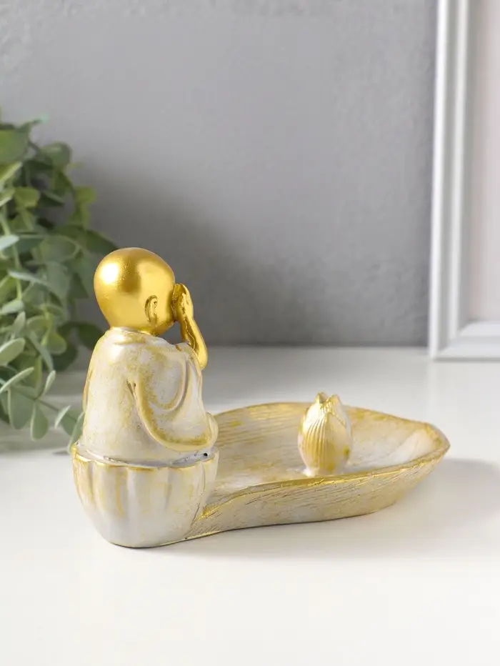 Подставка под благовония полистоун "Маленький послушник и лист" беж с патиной 18х10х10,5 см 10964