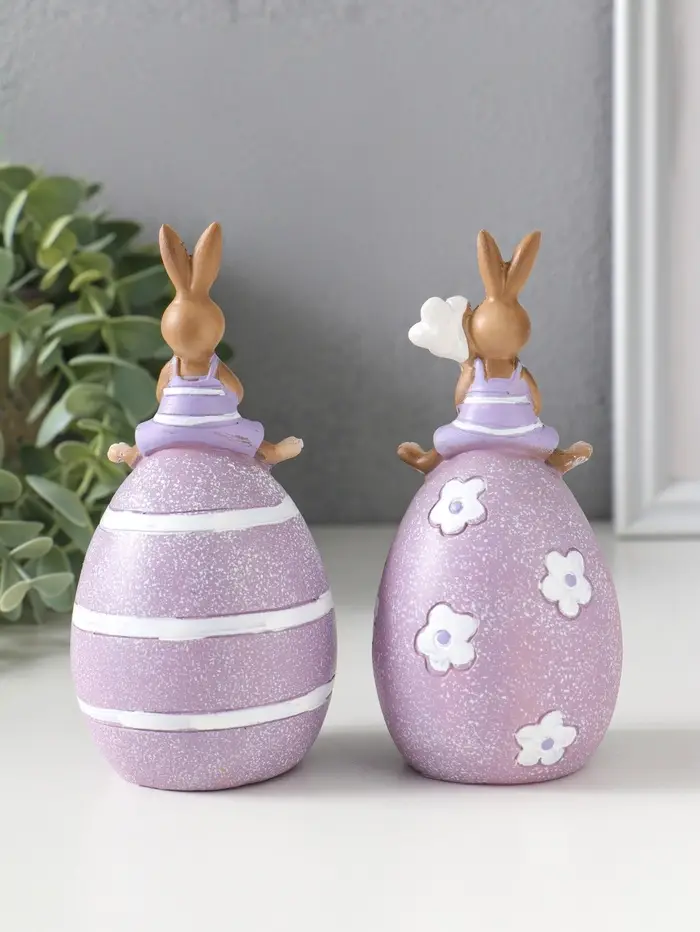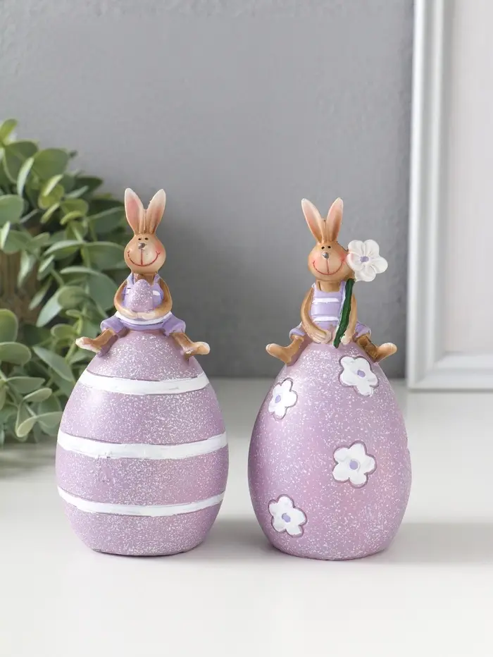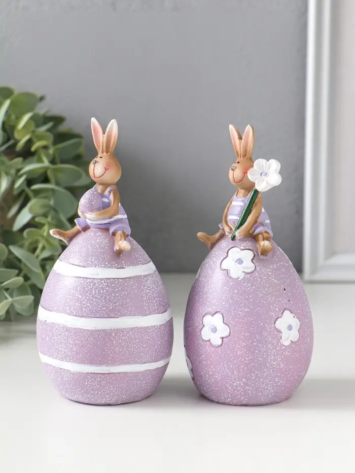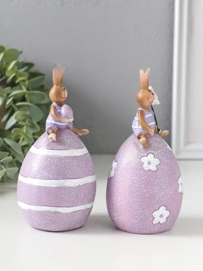 Сувенир полистоун "Лавандовые зайчики верхом на пасхальных яичках" набор 2 шт 6,5х6,5х13 см 109158