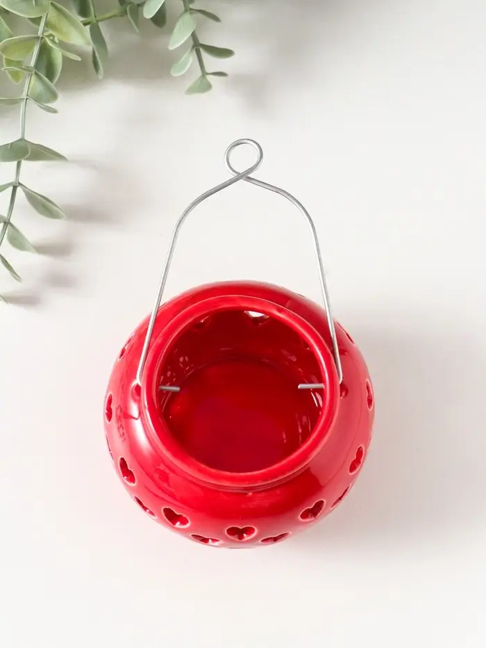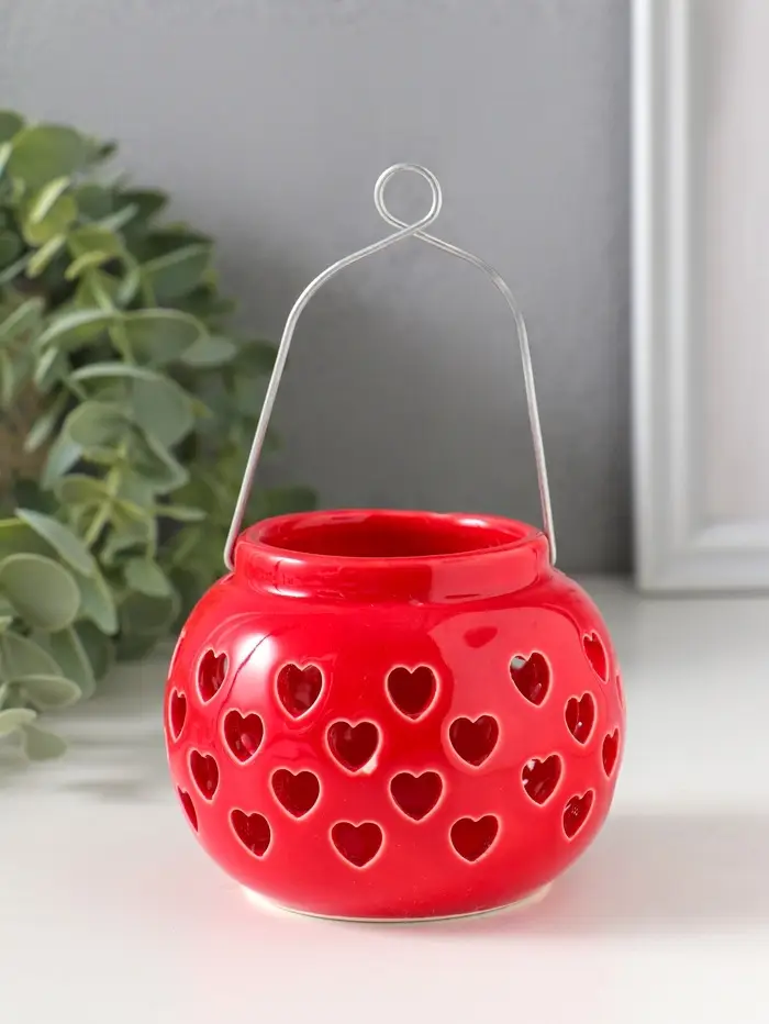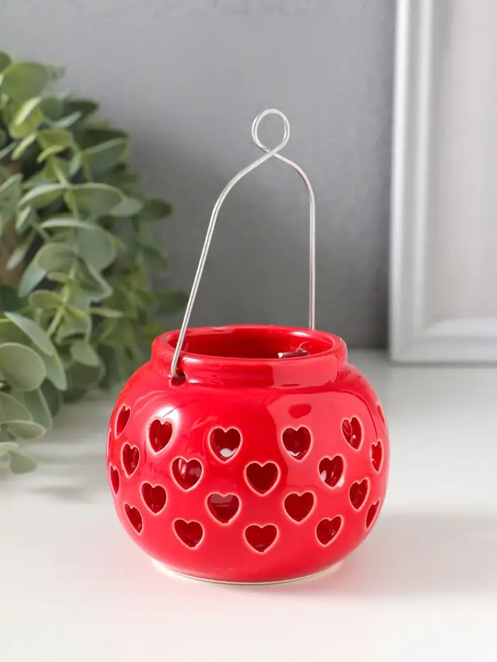 Подсвечник керамика 1 свеча "Фонарик с сердцами" красный 8х8х6,7 см