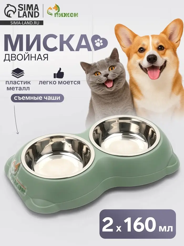 Двойная миска — практичное решение для кормления кошек и собак. Металлические чаши объёмом по 160 мл каждая надёжно закреплены в прочном пластиковом корпусе, который не скользит даже при активном использовании.