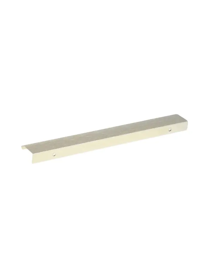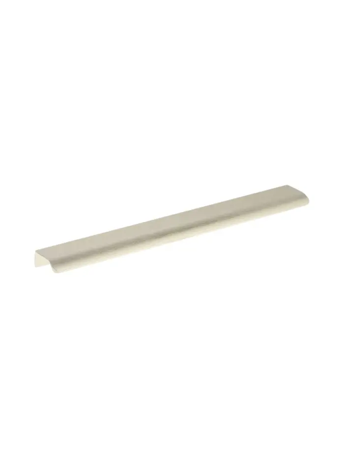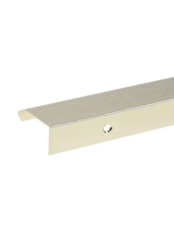 Торцевая мебельная ручка, длина 300 мм, межосевое расстояние 224 мм, алюминий, цвет сатиновое золото — фурнитура для фасадов шкафов-купе, гардеробных и комодов. Изготовлена из алюминия с покрытием под сатиновое золото. Г-образная форма с удлиненной консолью удобна для захвата. Торцевое расположение подходит для фасадов без выступающих элементов.