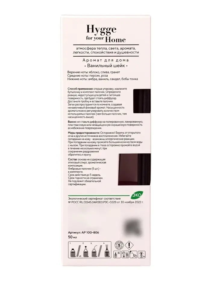 Диффузор ароматический с палочками Hygge Home Ванильный шейк, 50 мл