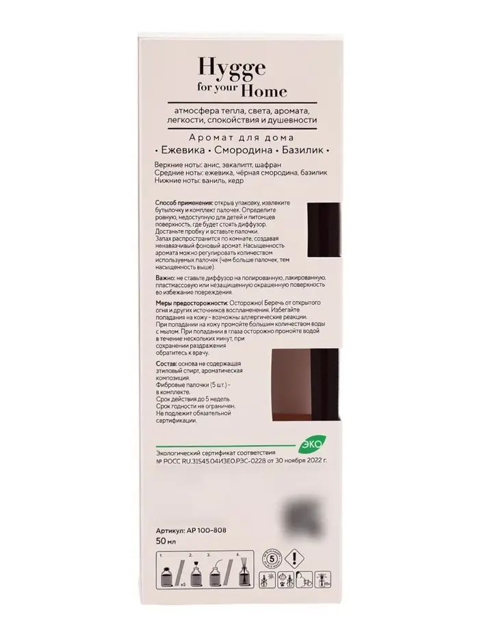 Диффузор ароматический с палочками Hygge Home Ежевика, Смородина, Базилик, 50 мл