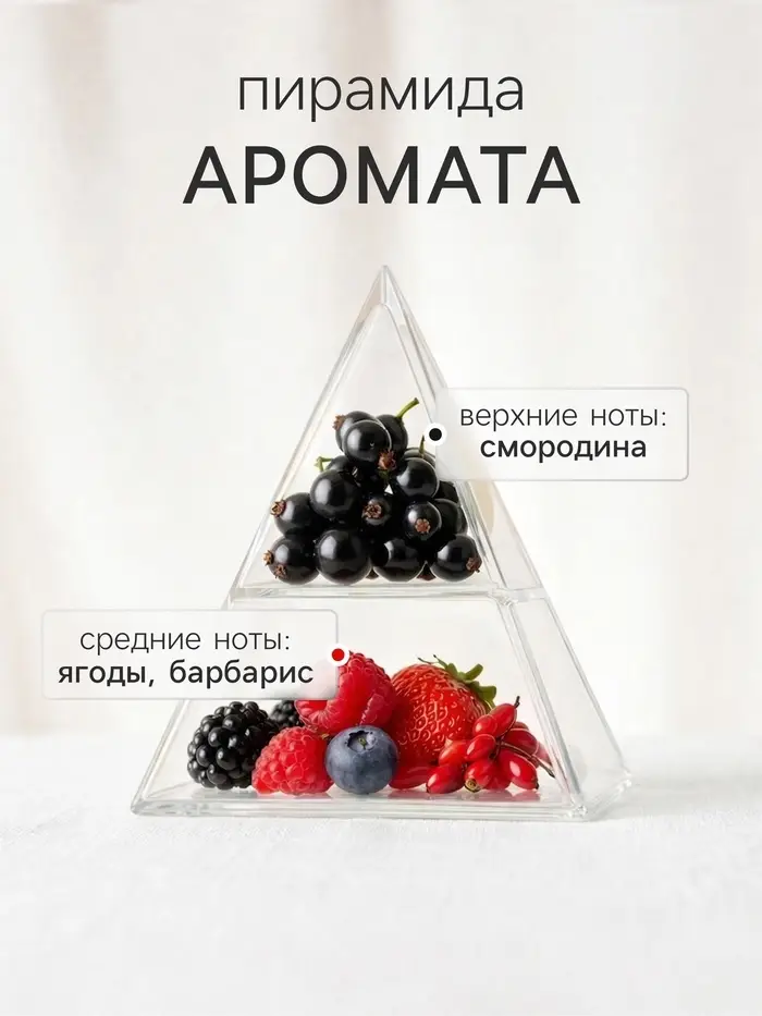 Аромат раскрывается глубоко и многогранно: в начале ощущается сочная кисло-сладкая красная смородина и терпкие ягоды годжи, создавая насыщенное и слегка винное звучание. В сердце композиции проявляются барбарисовые акценты, добавляющие лёгкую пикантность и свежесть. Завершают аромат нежные цветочные оттенки шиповника, которые смягчают композицию и делают её более утончённой.