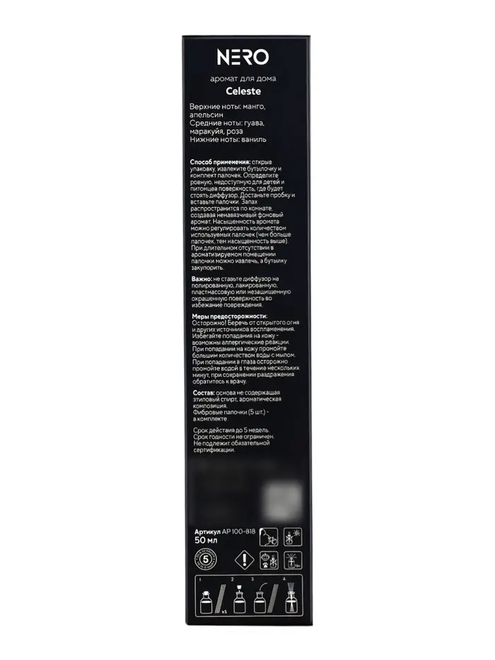 Nero Celeste — это сочетание сочных тропических фруктов, нежных цветочных нот и мягкой ванильной базы, которое наполняет пространство теплом, уютом и лёгким ощущением праздника.